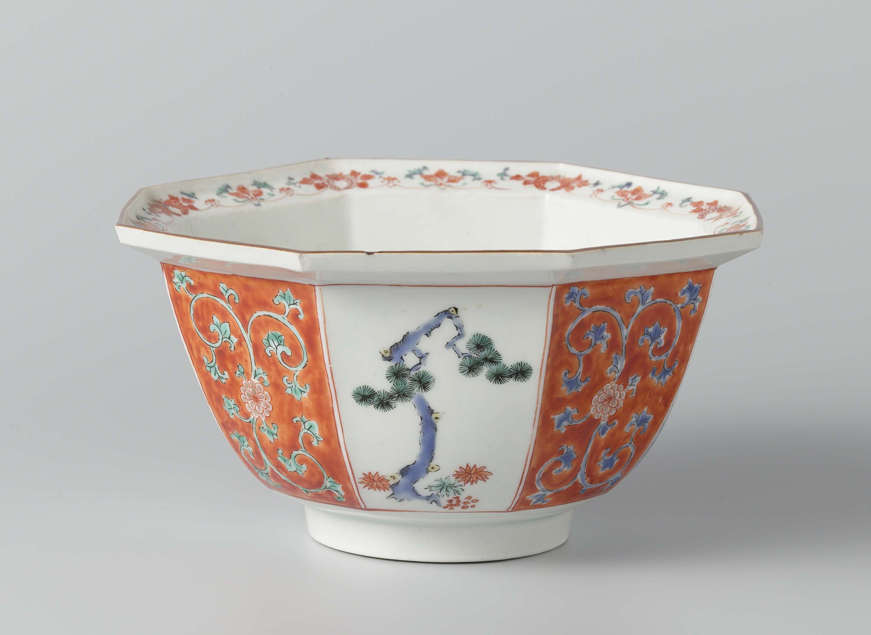 Achthoekige kom met opstaande rand, beschilderd op het glazuur in rood, groen, geel, zwart en goud met op de zijden van de buitenwand beurtelings bloemranken tegen een rood font en de 'drie vrienden van de winter' (prunus, bamboe, pijnboom), op de binnenkant in de kom een hoo-vogel en blad- en bloemranken op de rand. Kakiemon. (Nederlands)
