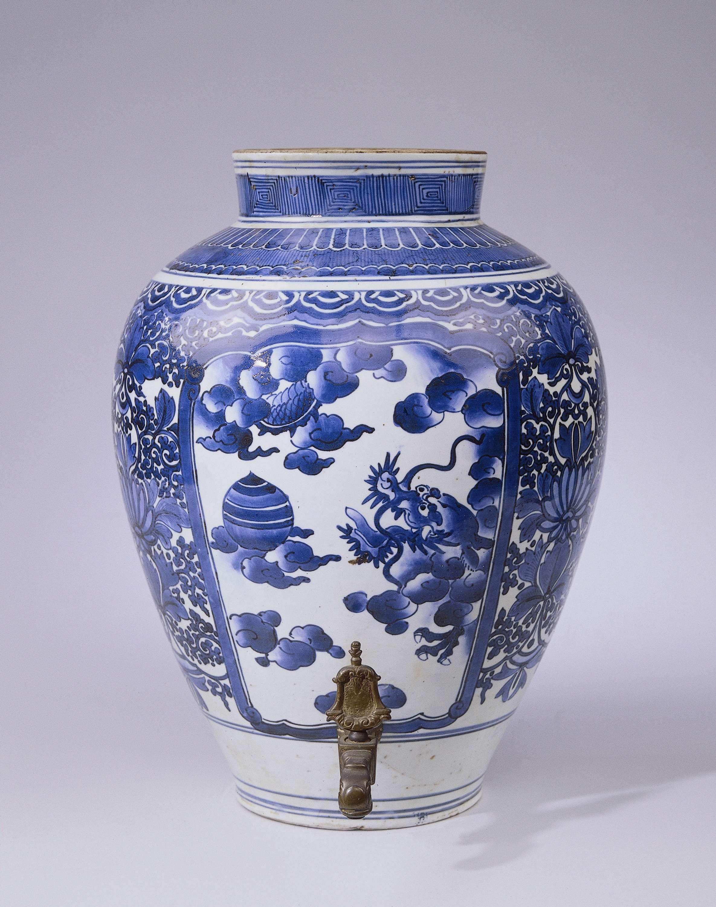 Eivormige pot (fonteinpot) van porselein, beschilderd in onderglazuur blauw. Op de buik tweemaal een bloeiende plant (pioen) en vlinders bij een rots met daartussen een orchidee. Op de schouder een band met een swastika-patroon onderbroken door vier gelobde cartouches met kostbaarheden (artemisiablad) op een kwast. De nek met een band gestileerde bladmotieven. Onderaan de buik is later een metalen kraan bevestigd. De deksel met een doorlopend landschap met rotsen, bomen en wolken. Deksel is niet bijpassend. Twee chips in de rand. Arita, blauw-wit. (Nederlands)