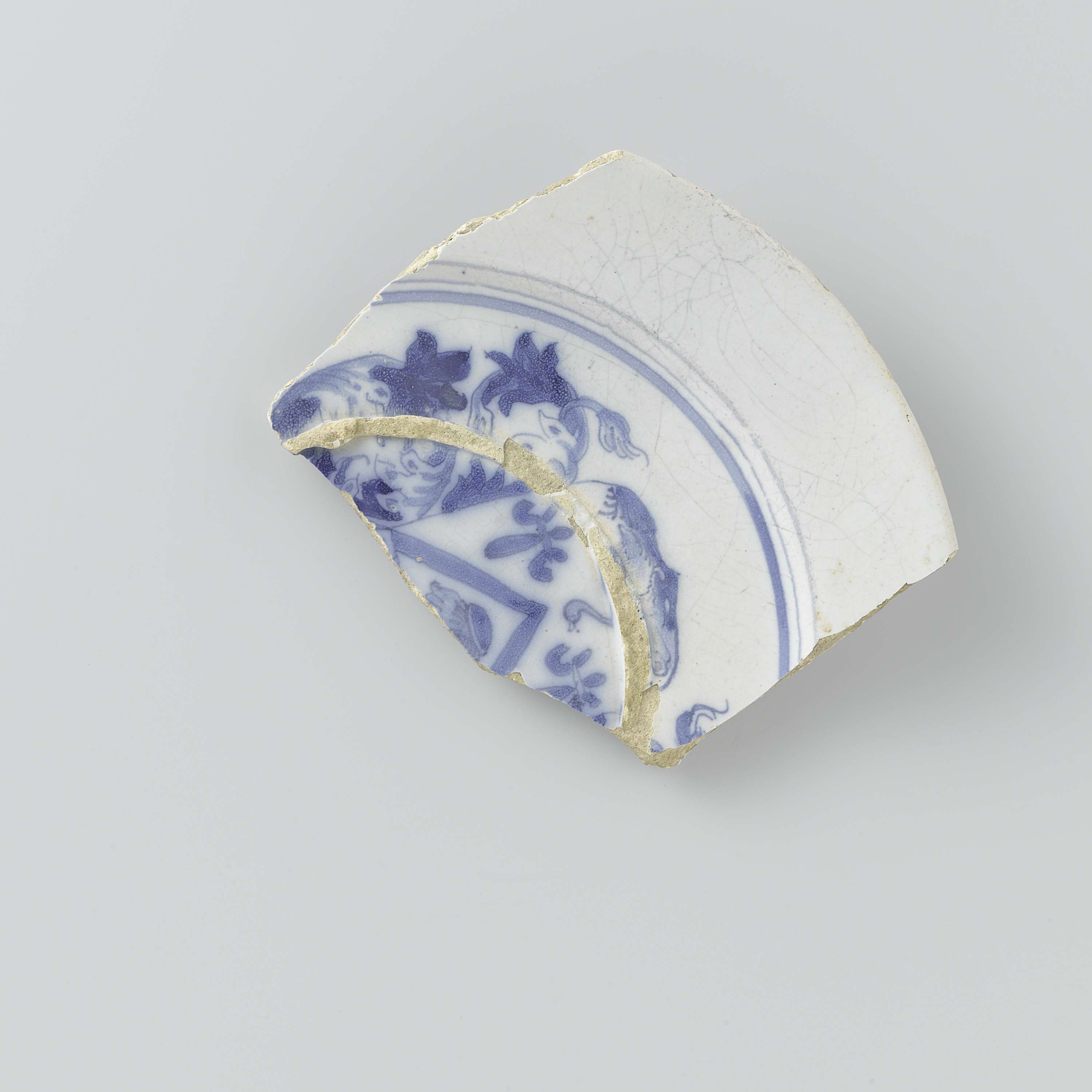Fragment van een bord van faience. Het plat is beschilderd in blauw onder het glazuur met een wapenschild met dekkleden, omgeven door concentrische cirkels. Door de voorstelling heen loopt een halfcirkelvormige beschadiging (Nederlands)