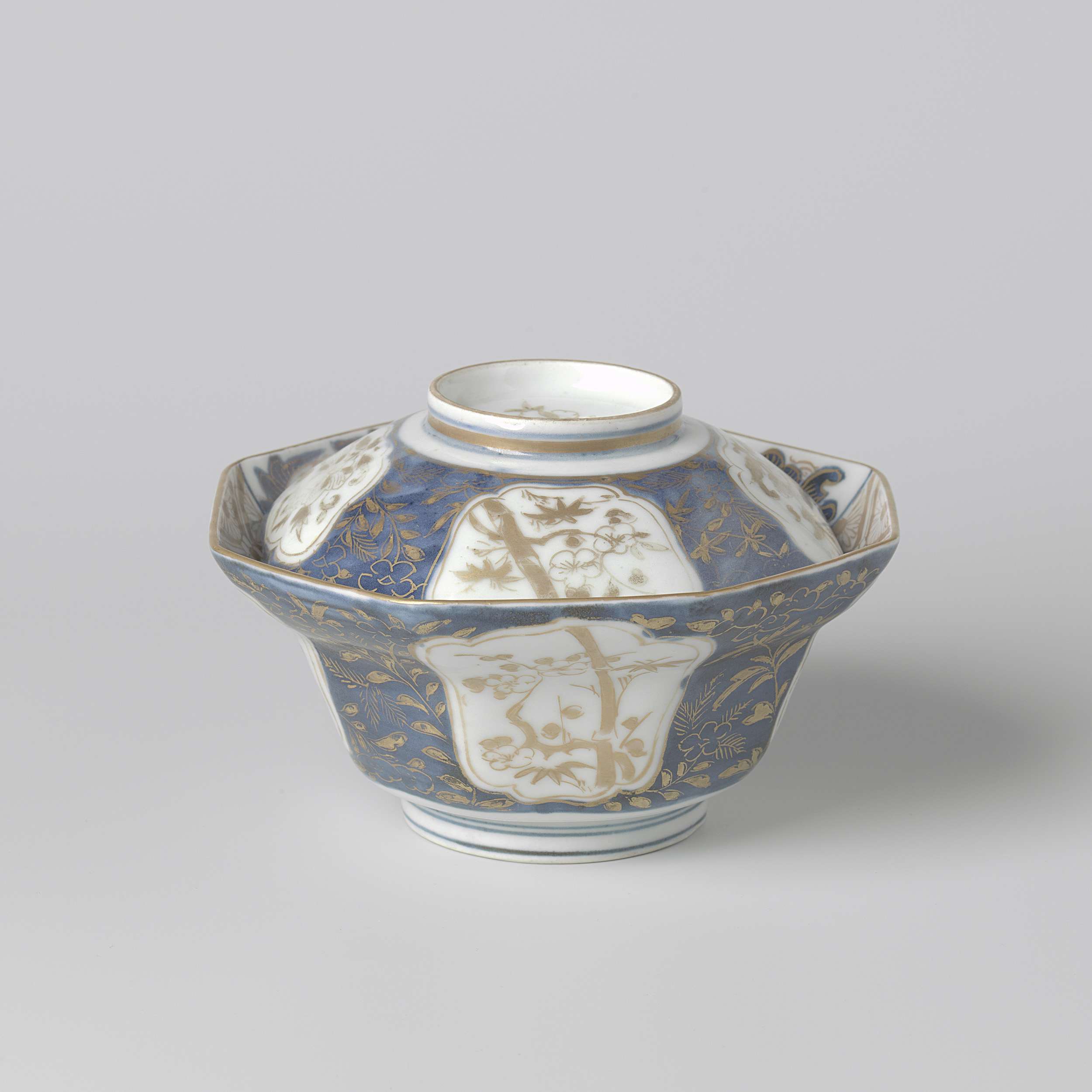 Achtkantige, klokvormige dekselkom met onderschotel van porselein, beschilderd in onderglazuur blauw en op het glazuur goud. De buitenzijde van de kom is bedekt met onderglazuur blauw met daarop bloemtakken in goud. Daarin uitgespaard vier geschulpte cartouches met bloeiende planten (prunus, bamboe) en een gestileerde pioen. Op de bodem een bloemenvaas. De binnenrand met acht vakken met gestileerde bloemen en bloemranken. De deksel met dezelfde decoratie. Imari. (Nederlands)