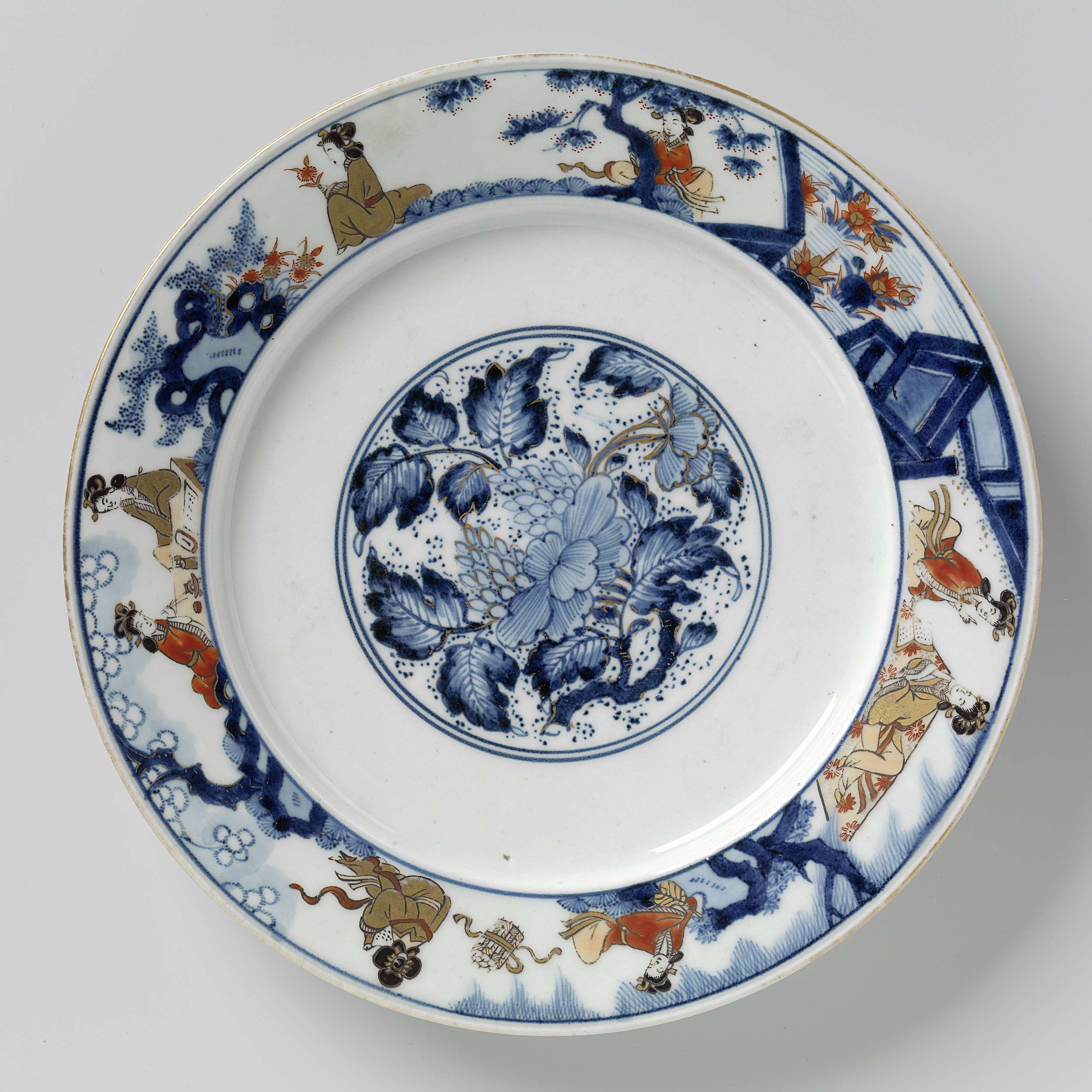 Bord van porselein, beschilderd in onderglazuur blauw en op het glazuur rood, zwart en goud. Op het plat een medaillon met een pioentak. De binnenrand met een doorlopende omheinde tuin met daarin vrouwen die verschillende activiteiten uitvoeren: één vrouw leest de ander voor uit een boek, een liggende vrouw met een waaier naast bijeengebonden rollen waar een zittende vrouw één van leest, twee vrouwen aan een tafel, een zittende vrouw met een bloem (prachtanjer) een zittende vrouw achter een boom. De buitenwand en -rand met tien bloeiende planten. Op de onderzijde een medaillon van pioenranken. Vijf proenen op de onderzijde. Imari. (Nederlands)