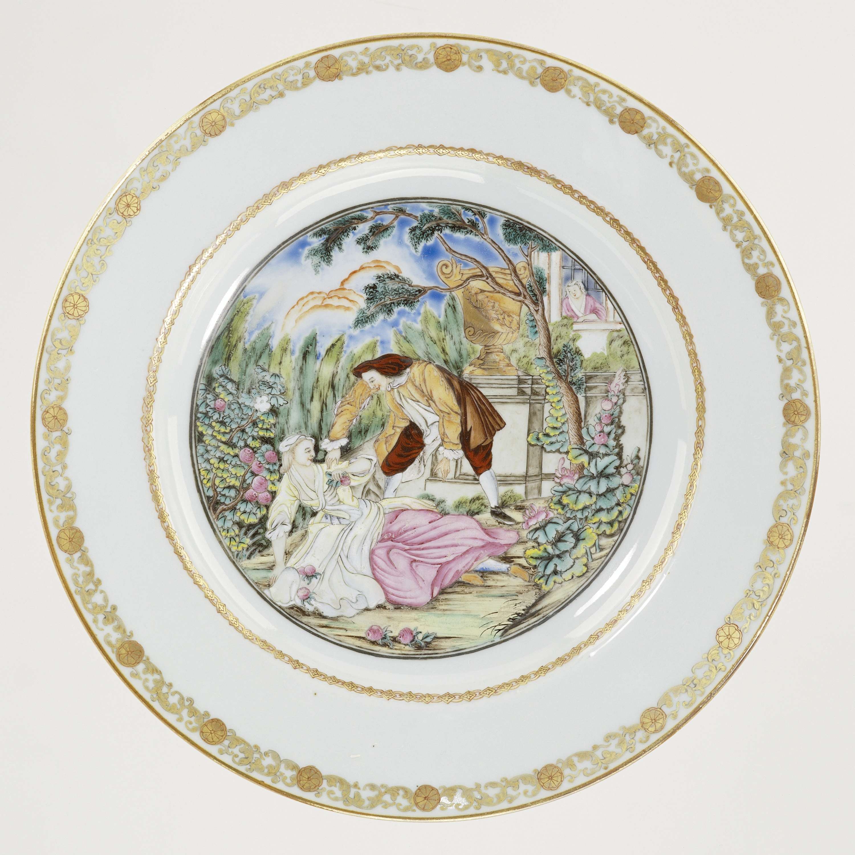 Bord op voetring met een platte rand. In emailkleuren gedecoreerd. Op het plat een scène waarbij een gevallen vrouw de hand wordt gereikt door een heer. De situatie speelt zich af op een terras in een tuin, links op de achtergrond een huis. In het huis een vrouw, zij kijkt naar de figuren op de voorgrond. De gravure die als voorbeeld heeft gediend werd gemaakt door Nicolas de Larmessin (1684-1753), met de titel La Servante Justifiée. Het is een vers uit de Vertellingen van La Fontaine. Deze scènes worden ook wel ‘galante’ scènes genoemd, en het genre was zeer populair. Van deze voorstelling zijn verschillende exemplaren bekend die soms licht afwijken van dit exemplaar en in het algemeen minder Europees van karakter zijn. Ze zijn vaak schematischer geschilderd. Bij de schematisch geschilderde exemplaren kan men zich afvragen wat de Chinese schilder als voorbeeld heeft gehad: een andere prent, of een kopie door een Chinese schilder. (Nederlands)