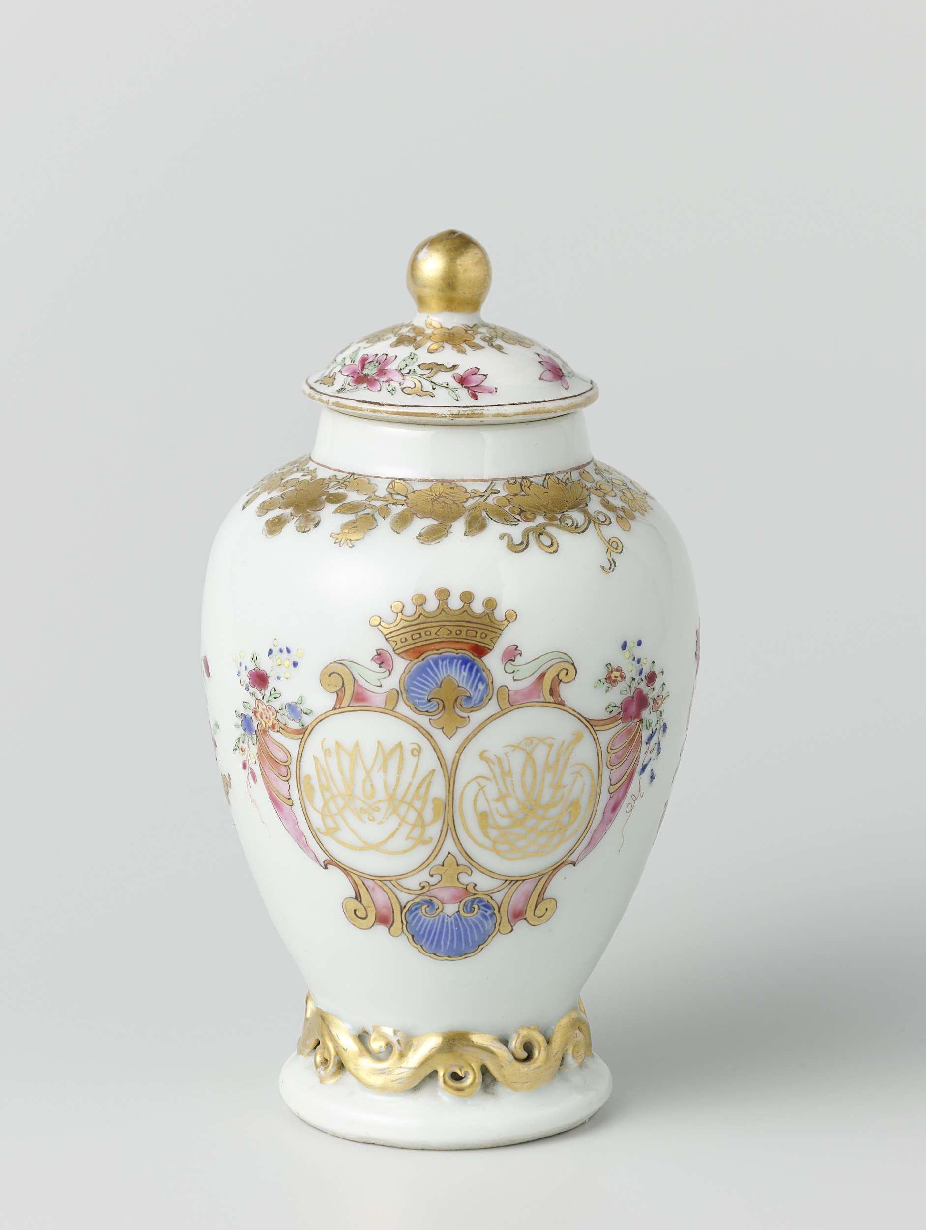 Theebus van porselein met eivormig lichaam, beschilderd op het glazuur in blauw, rood, roze, groen, geel, zwart en goud. Op de buik tweemaal een gekroond, dubbel spiegelmonogram met 'MVA' en 'CHTD' omgeven door schelpmotieven, krulwerk en bloemtakken; tussen de monogrammen een lotustak. Op de schouder met een band met bloemranken; rond de voet een band met krulwerk in reliëf. De deksel met twee lotusranken en rond de knop een band met bloemranken. Europese voorstelling in emailkleuren. (Nederlands)