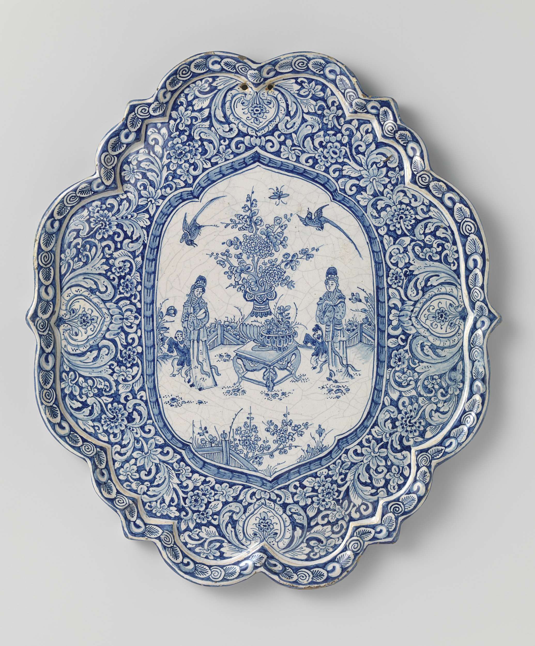 Plaat met geschulpte rand van faïence, in blauw beschilderd met twee vrouwen met kinderen en een bloemenvaas, in Chinese trant. (Nederlands)