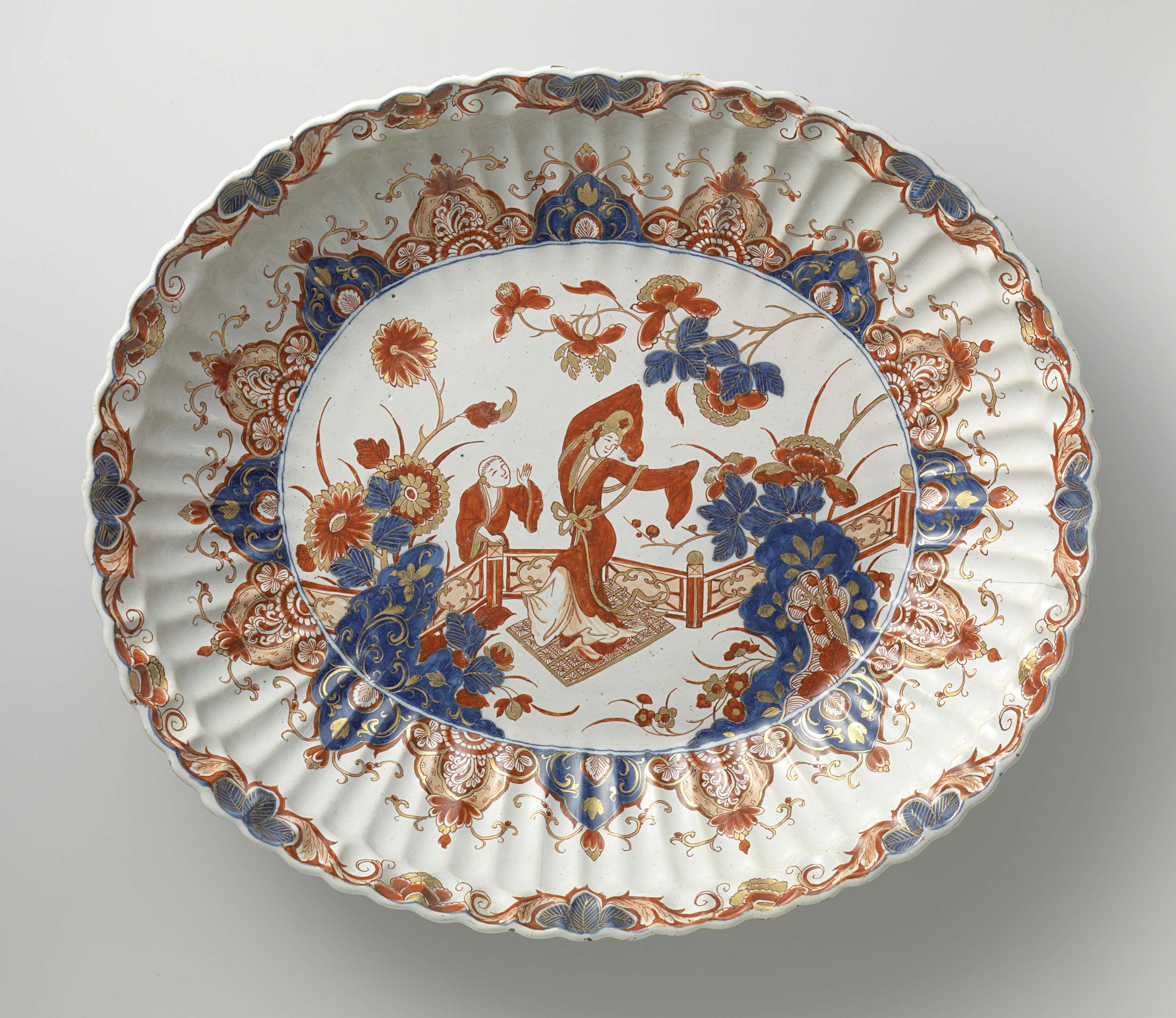 Schaal van faïence. Veelkleurig beschilderd met figuren in een tuin en lambrequinrand. (Nederlands)