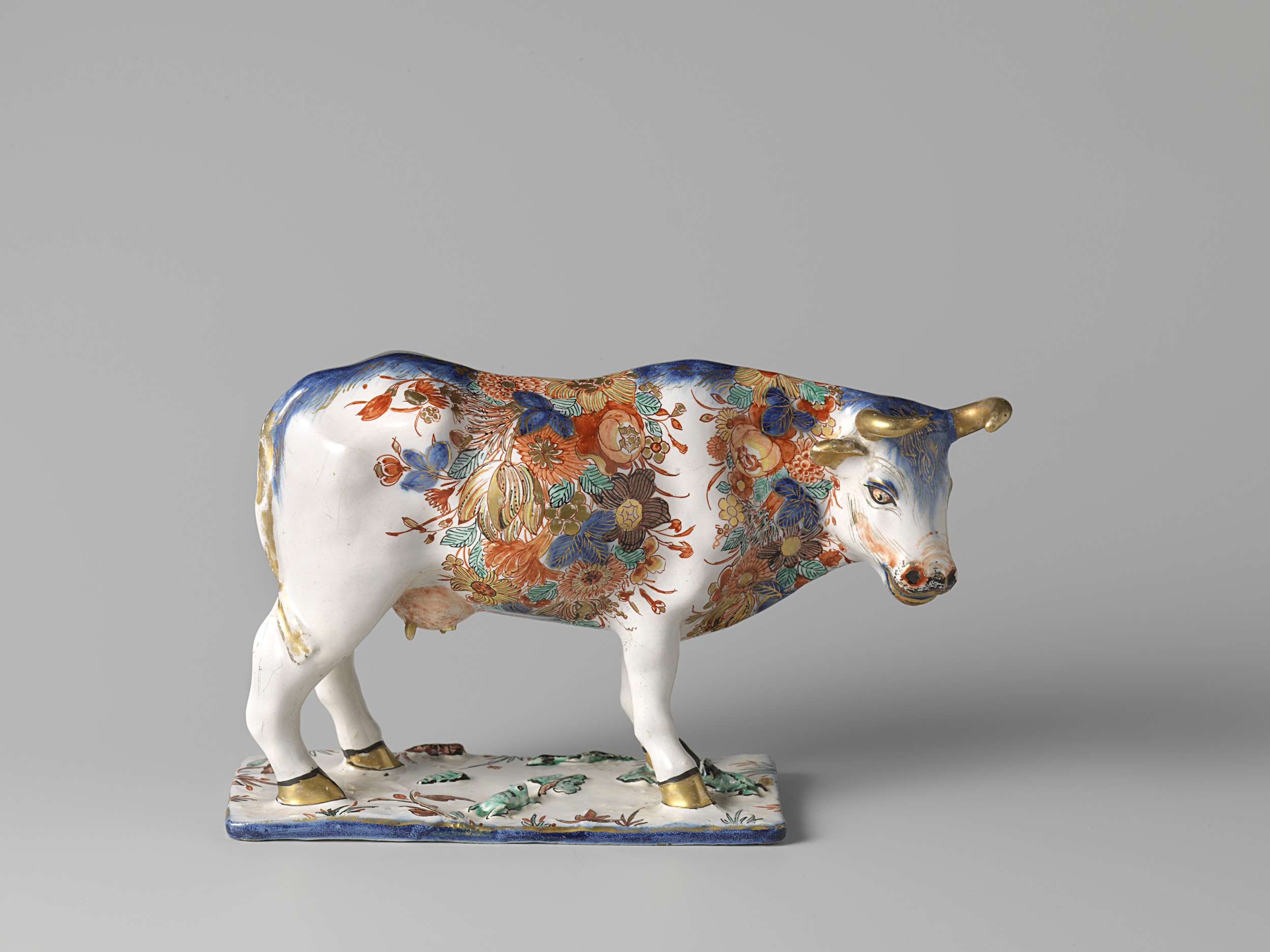 koe van faïence, veelkleurig beschilderd met bloemen. (Nederlands)