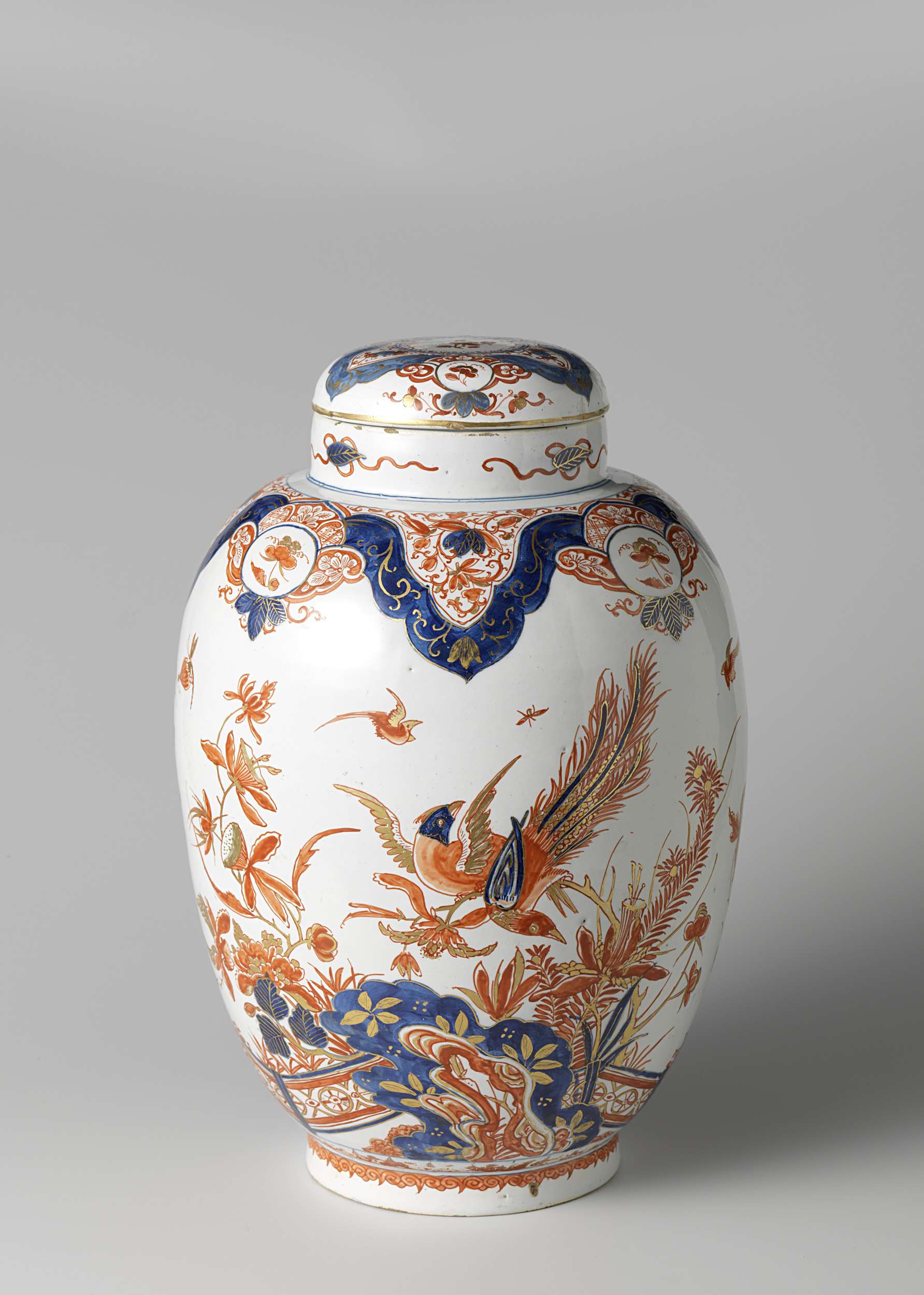 Pot van faïence met een platte deksel. Veelkleurig beschilderd met bloemtakken en vogels. (Nederlands)