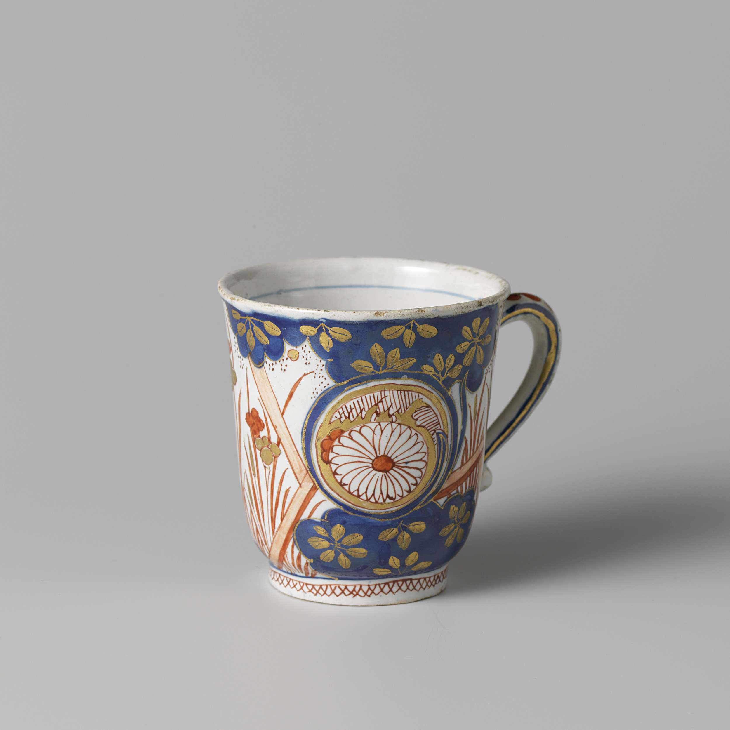 Kop van faience. Veelkleurig beschilderd met bloem- en bladdecoratie. (Nederlands)