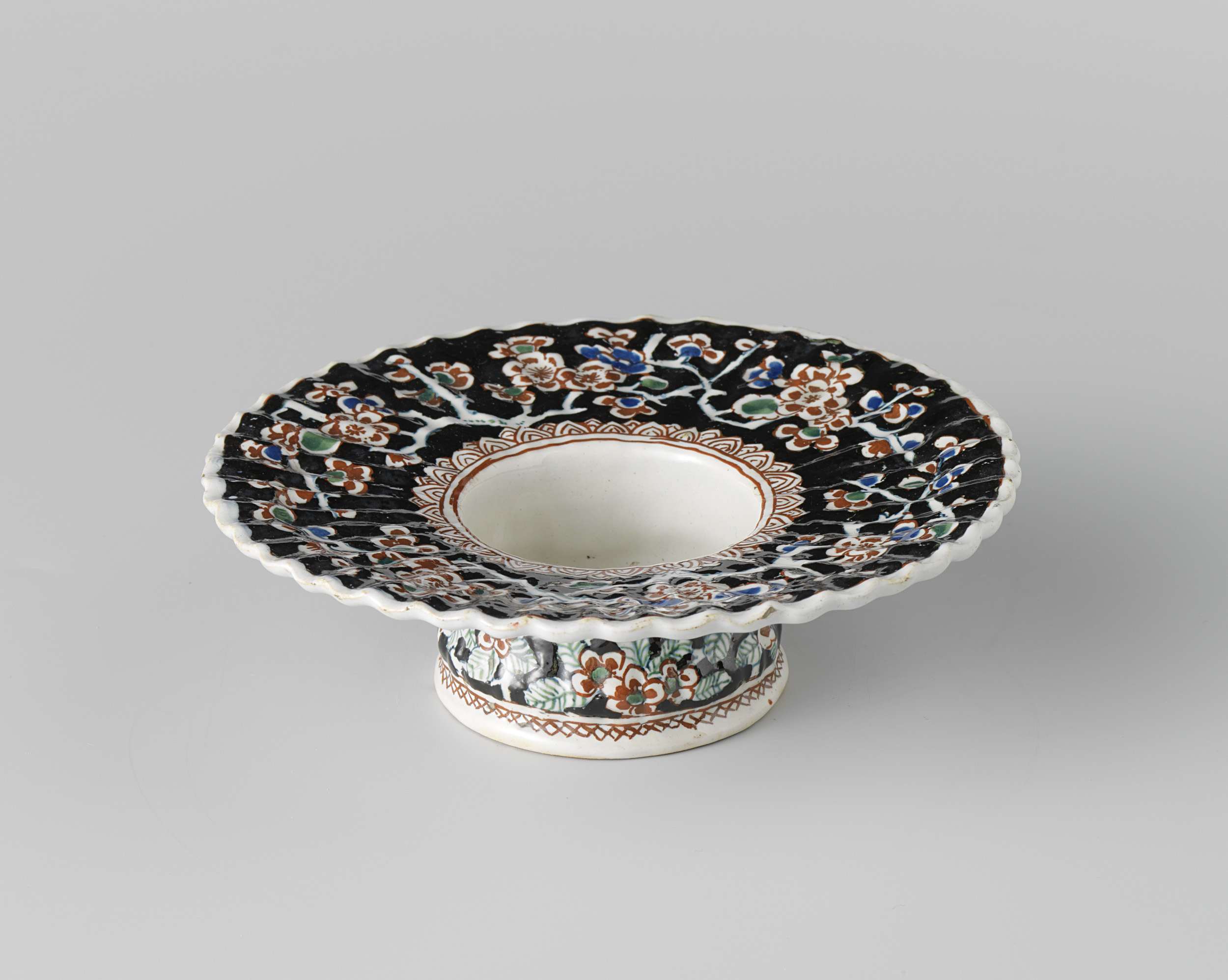 Schotel van faience, behorend tot een trembleuse. Veelkleurig beschilderd met bloemtakken. (Nederlands)