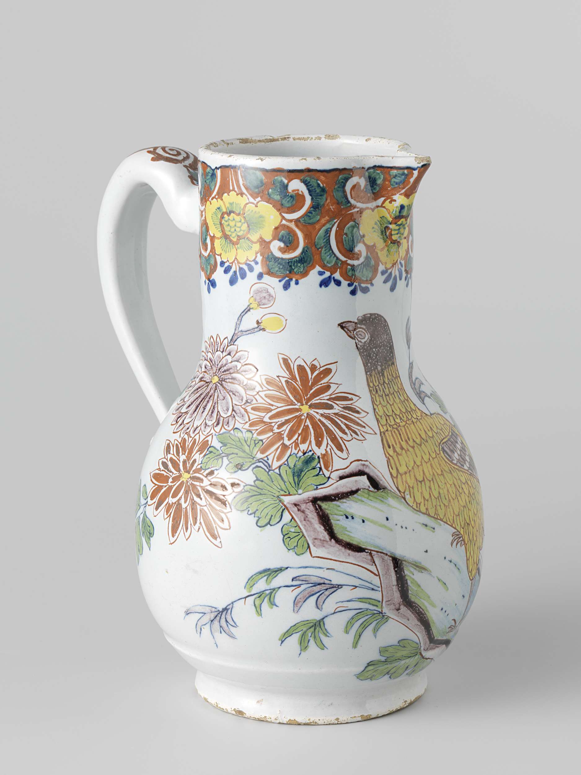 | Nederlands | Kan van faience, veelkleurig beschilderd met een vogel en bloemen. Met los zilveren deksel |