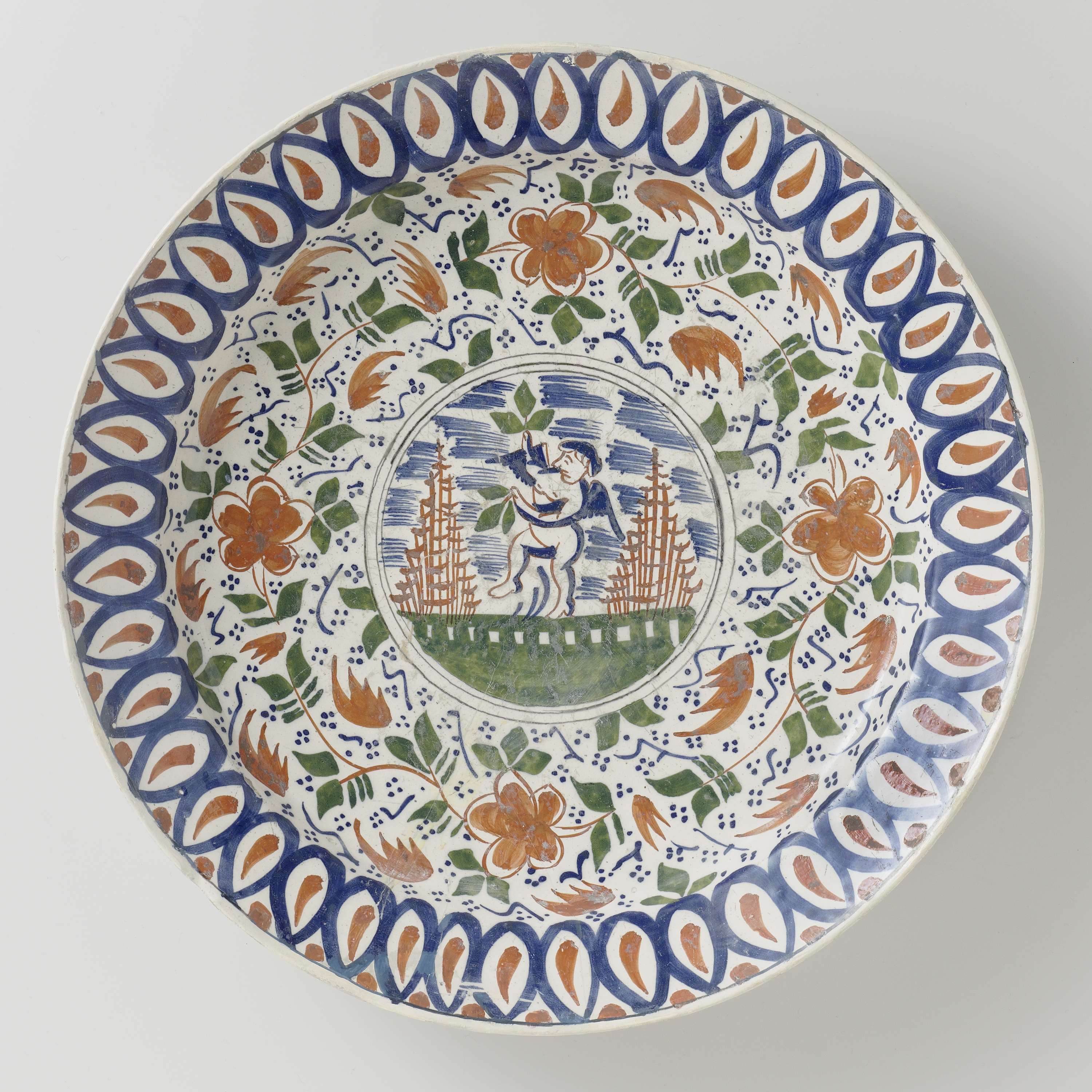 Schotel van faience. Veelkleurig beschilderd met Cupido en bloemen. (Nederlands)