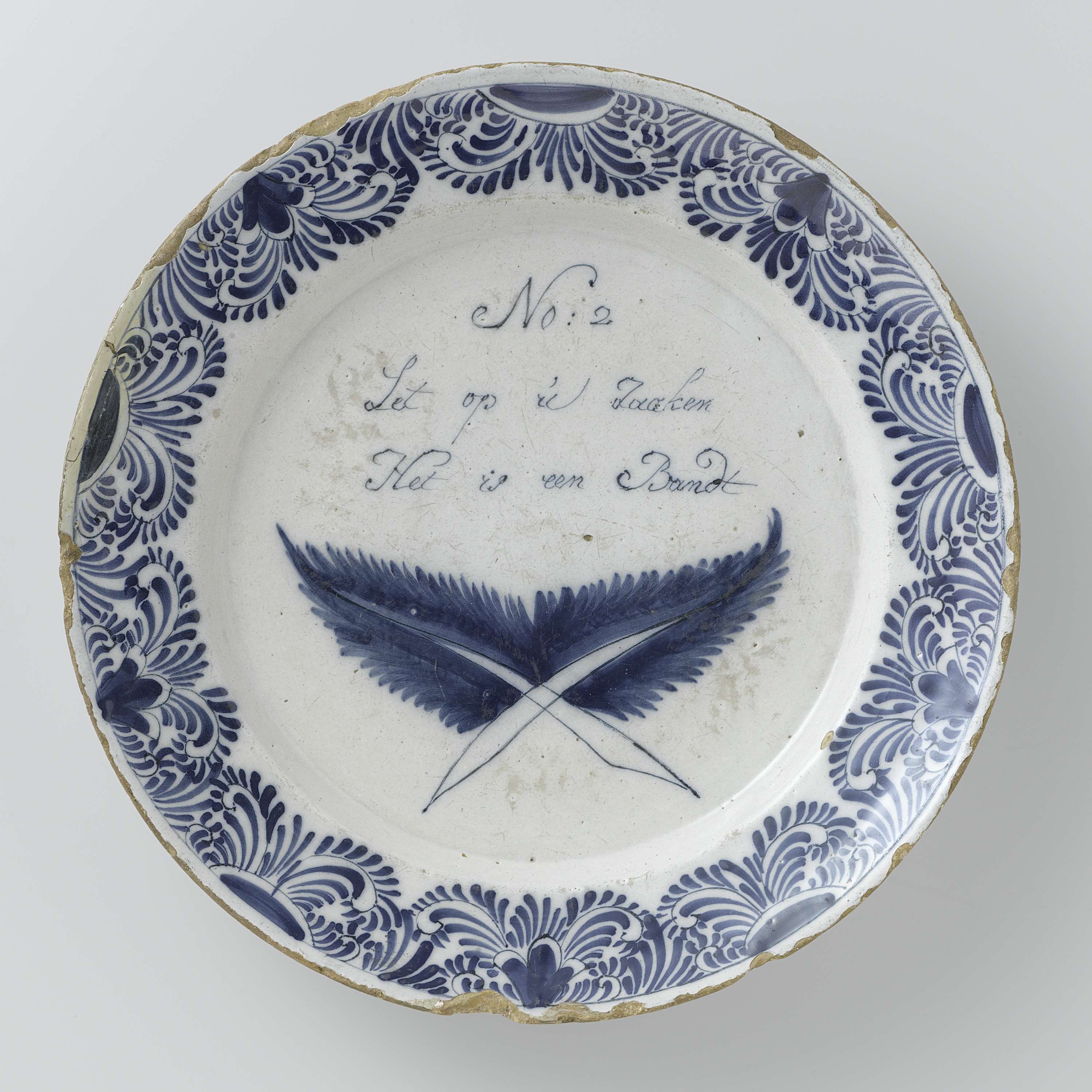 Schotel van faience. Blauw beschilderd met twee takken waartussen de woorden: Let op u zaaken Het is een Bandt. (Nederlands)