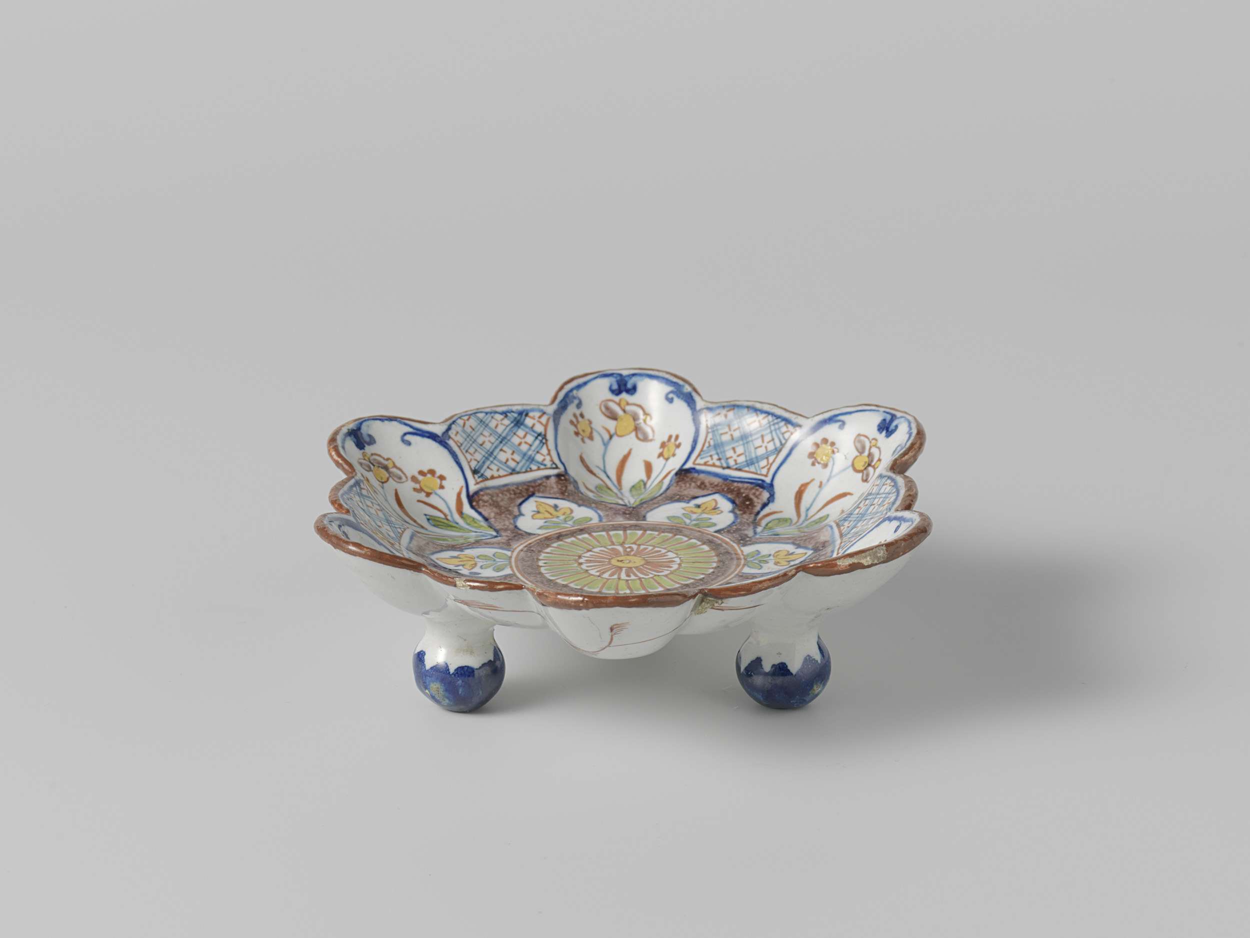 Schaal van faïence met gelobde rand. Veelkleurig beschilderd met bloemdecoraties. (Nederlands)