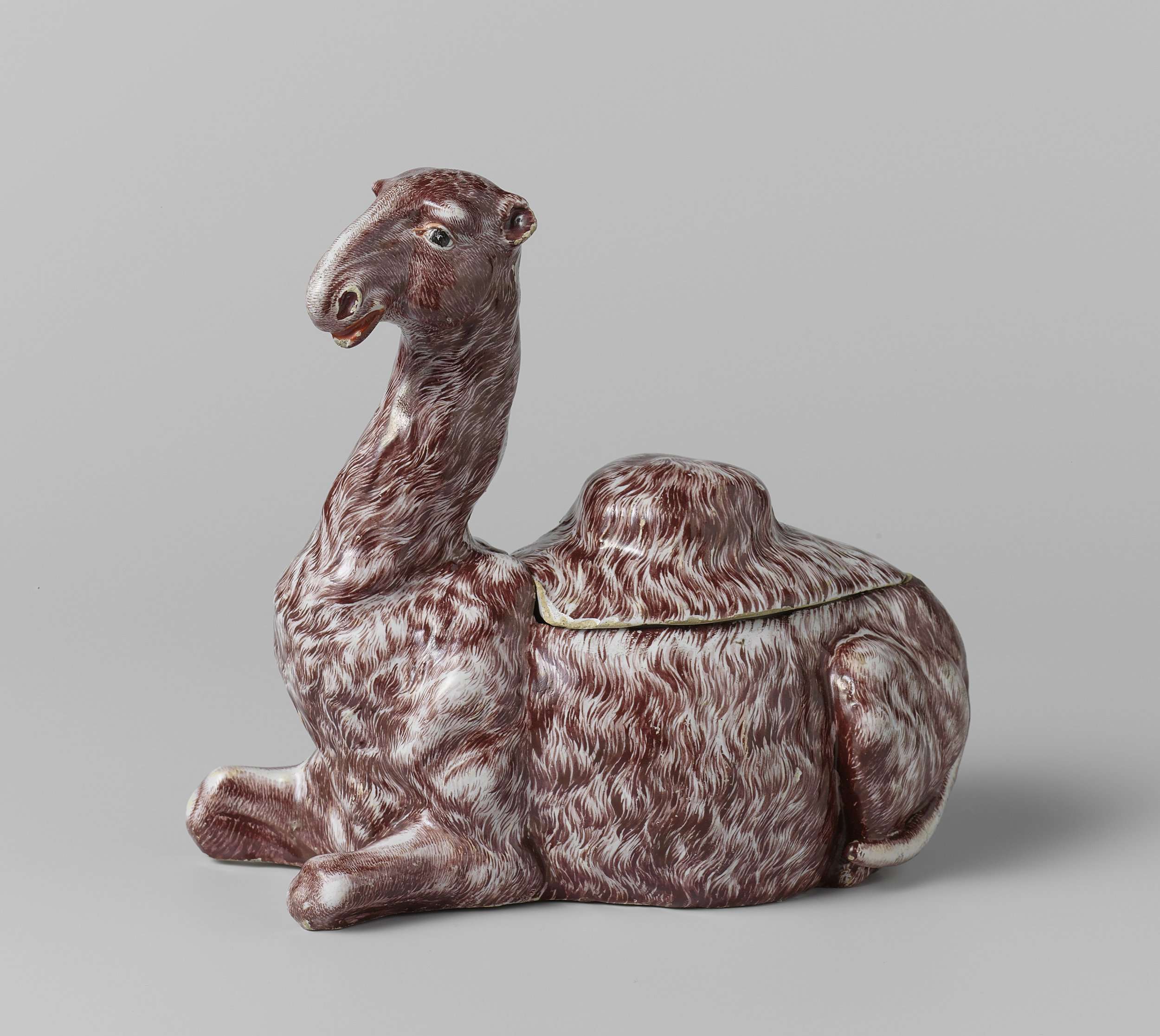 Terrine van faience, in de vorm van een dromedaris. Veelkleurig beschilderd. (Nederlands)