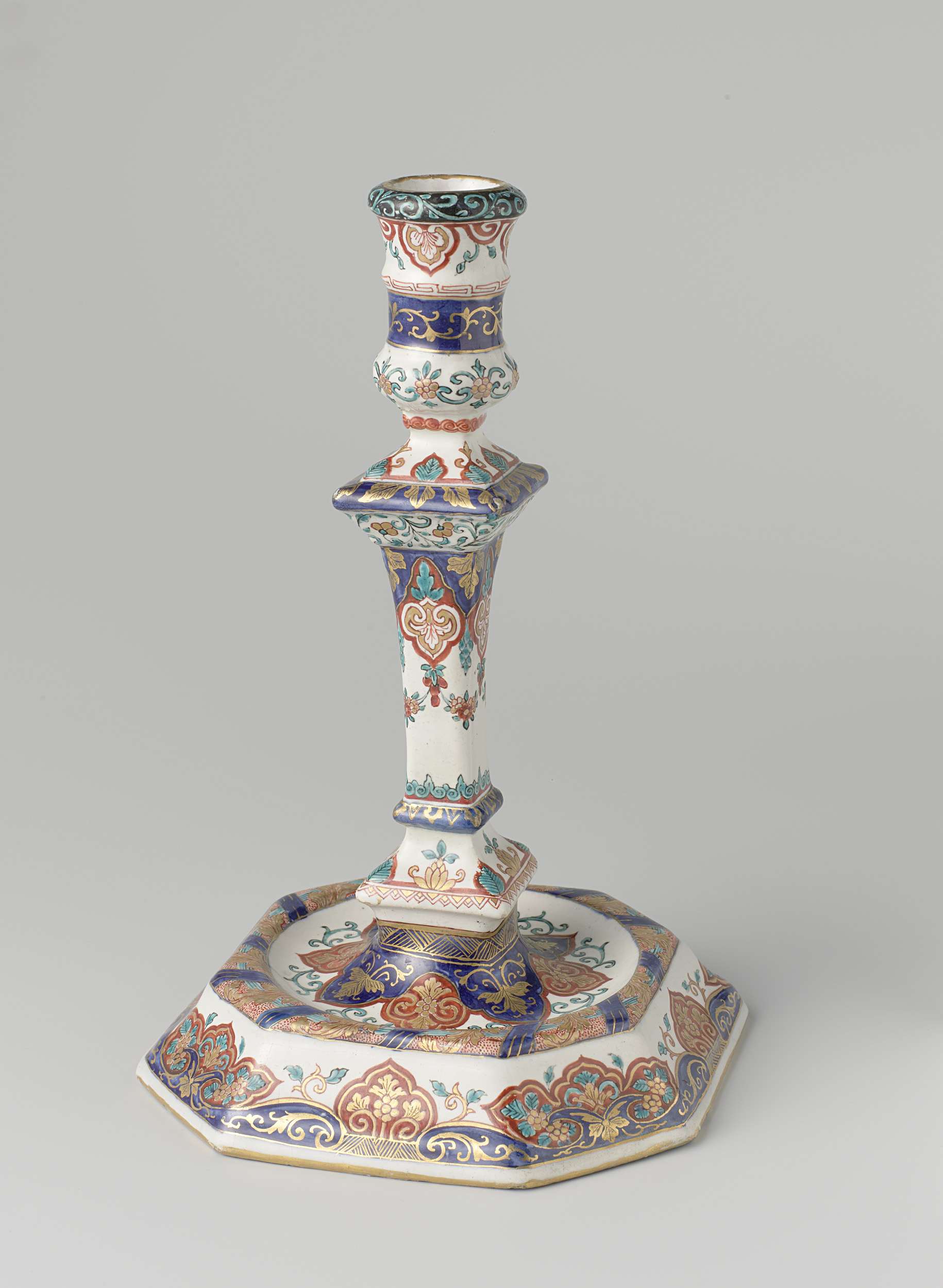 Kandelaar van faience, veelkleurig beschilderd, met vierkante schacht en ronde kaarsenhouder op achtkantige voet. Versieringen in rood, blauw, groen zwart en goud op witte grond. (Nederlands)