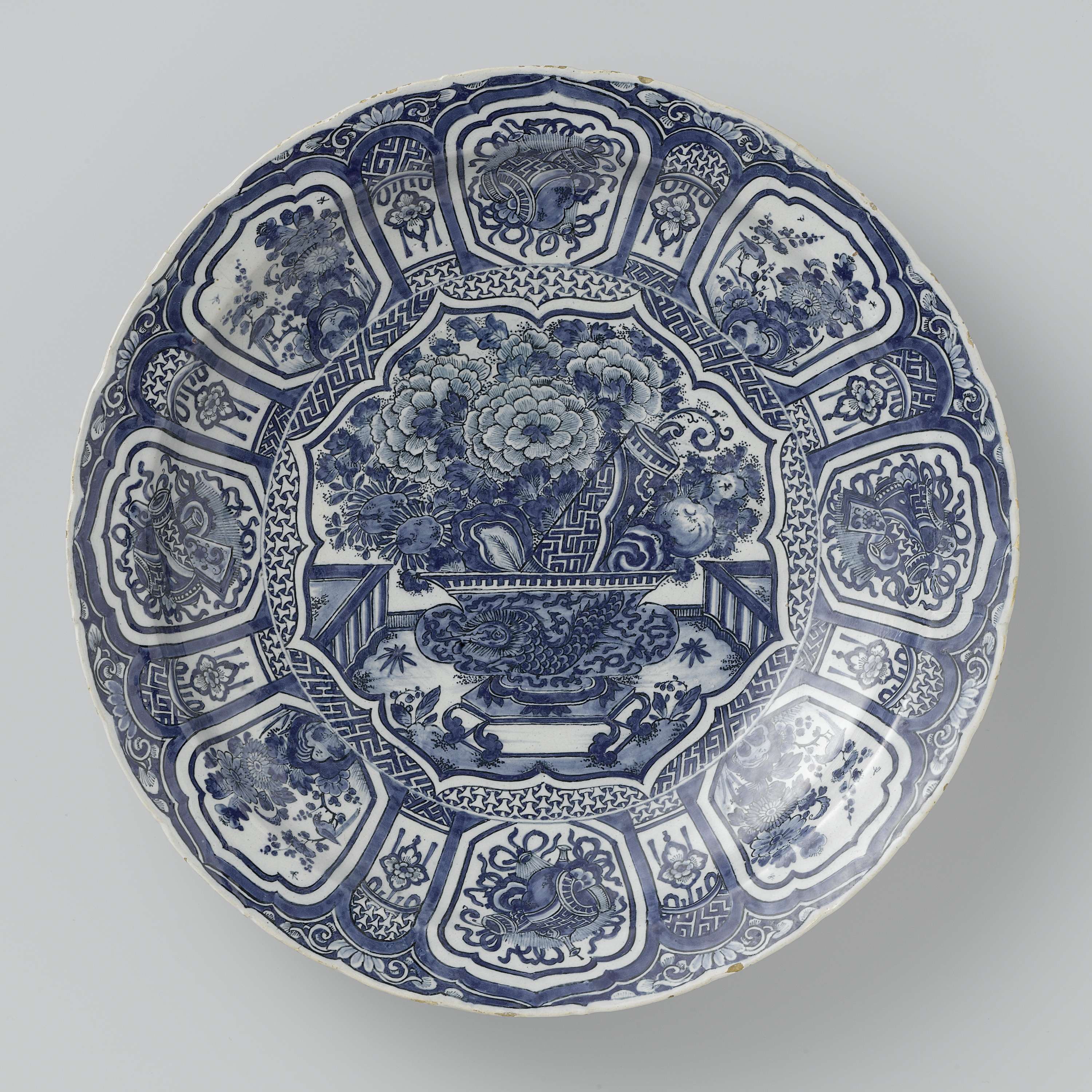schotel van aardewerk met blauwe beschildering op tinglazuur in Chinese trant. Op het plat een vaas grootendeels gevuld met bloemen. De rand is verdeeld in acht grote vlakken waarvan vier met Chinese emblemen en vier met bloemtakken en een vogel zijn versierd. (Nederlands)