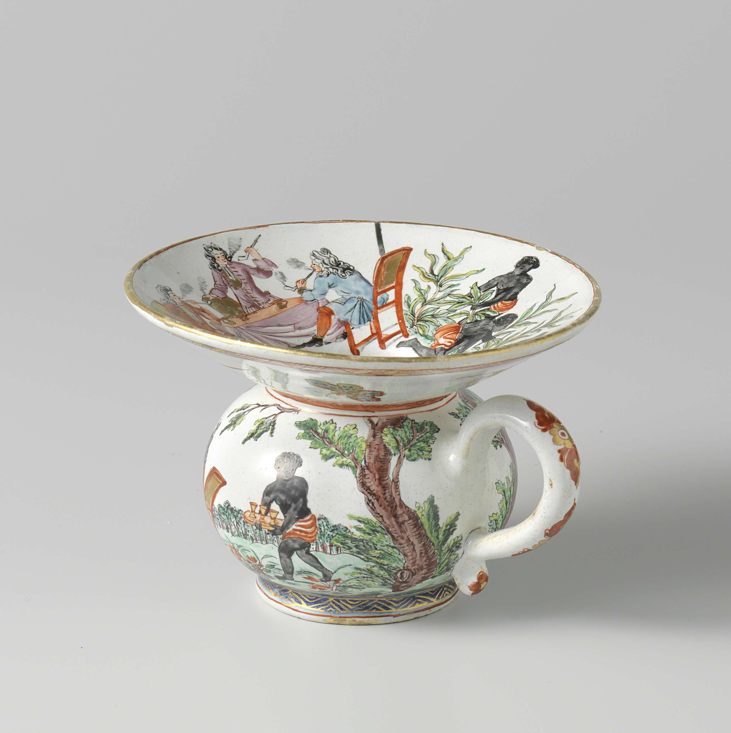Bolvormige kwispedoor met oor en uitlopende rand veelkleurig beschilderd met een doorlopende voorstelling van twee pijprokende heren en een zwarte man. Op de rand aan de bovenzijde zwarte mannen die tabaksbladeren plukken en tot rollen draaien. (Nederlands)