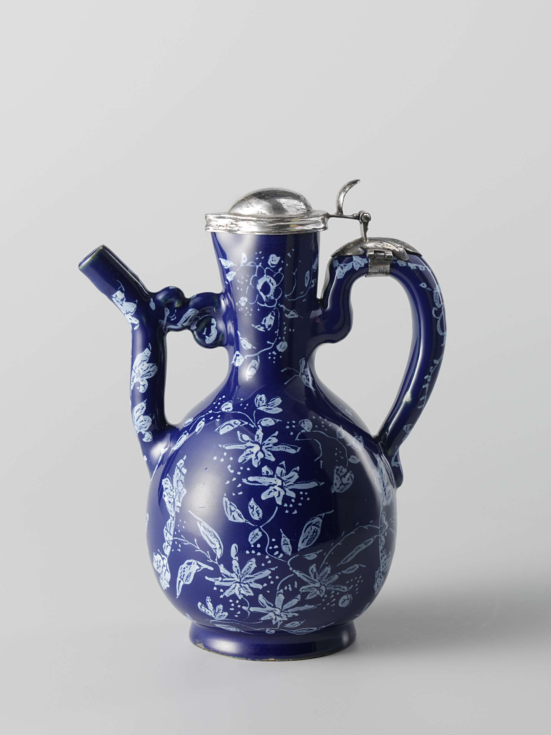 Kan, beschilderd met witte bloemen op een blauw fond (Nederlands)