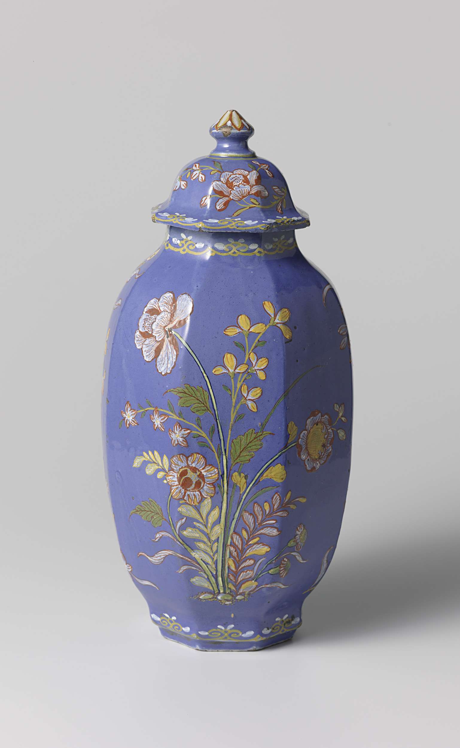 | Nederlands | Pot met deksel van veelkleurig beschilderde faïence |