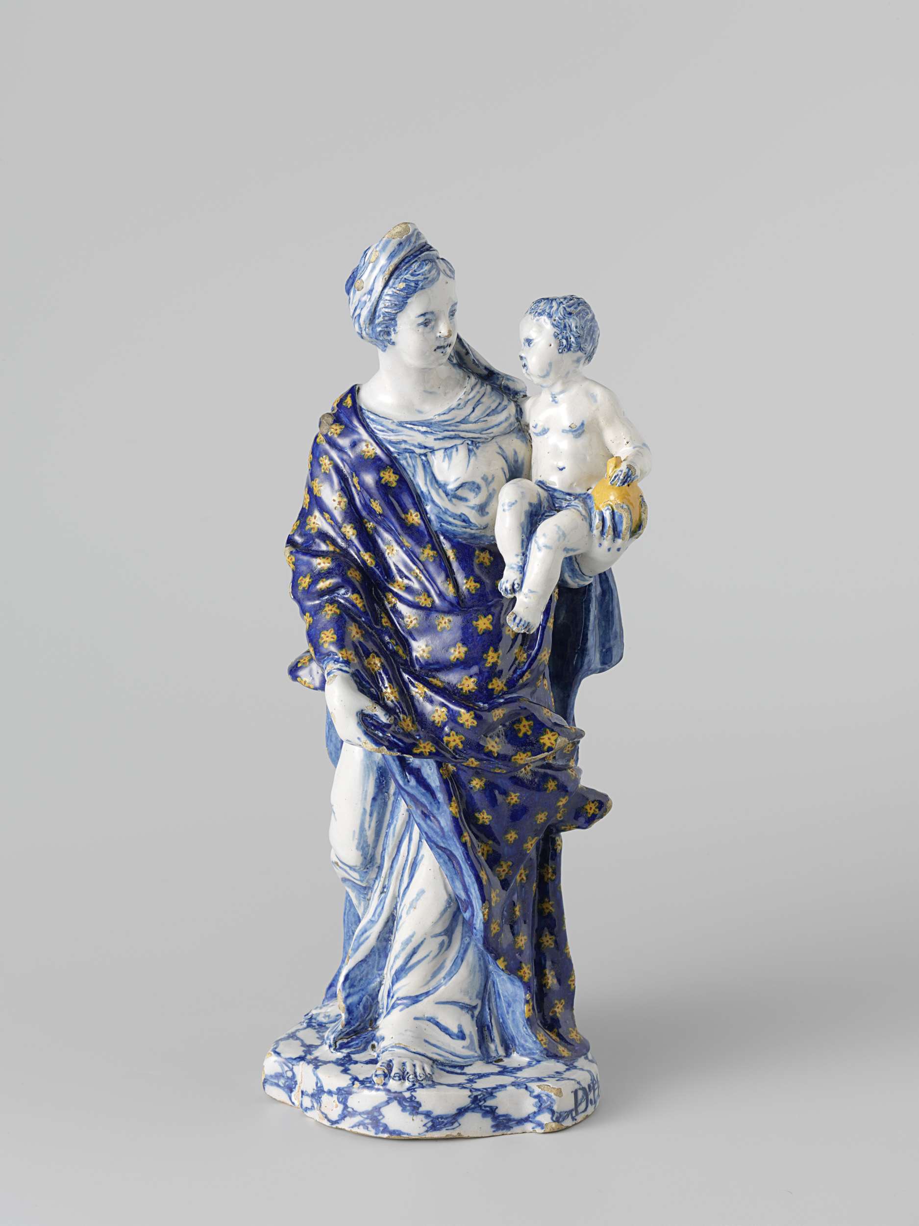 Figuur van faience, voorstellende Maria met Kind. Veelkleurig beschilderd. Op de achterkant van de plint gesigneerd: D: H:, en gedateerd 1749. (Nederlands)