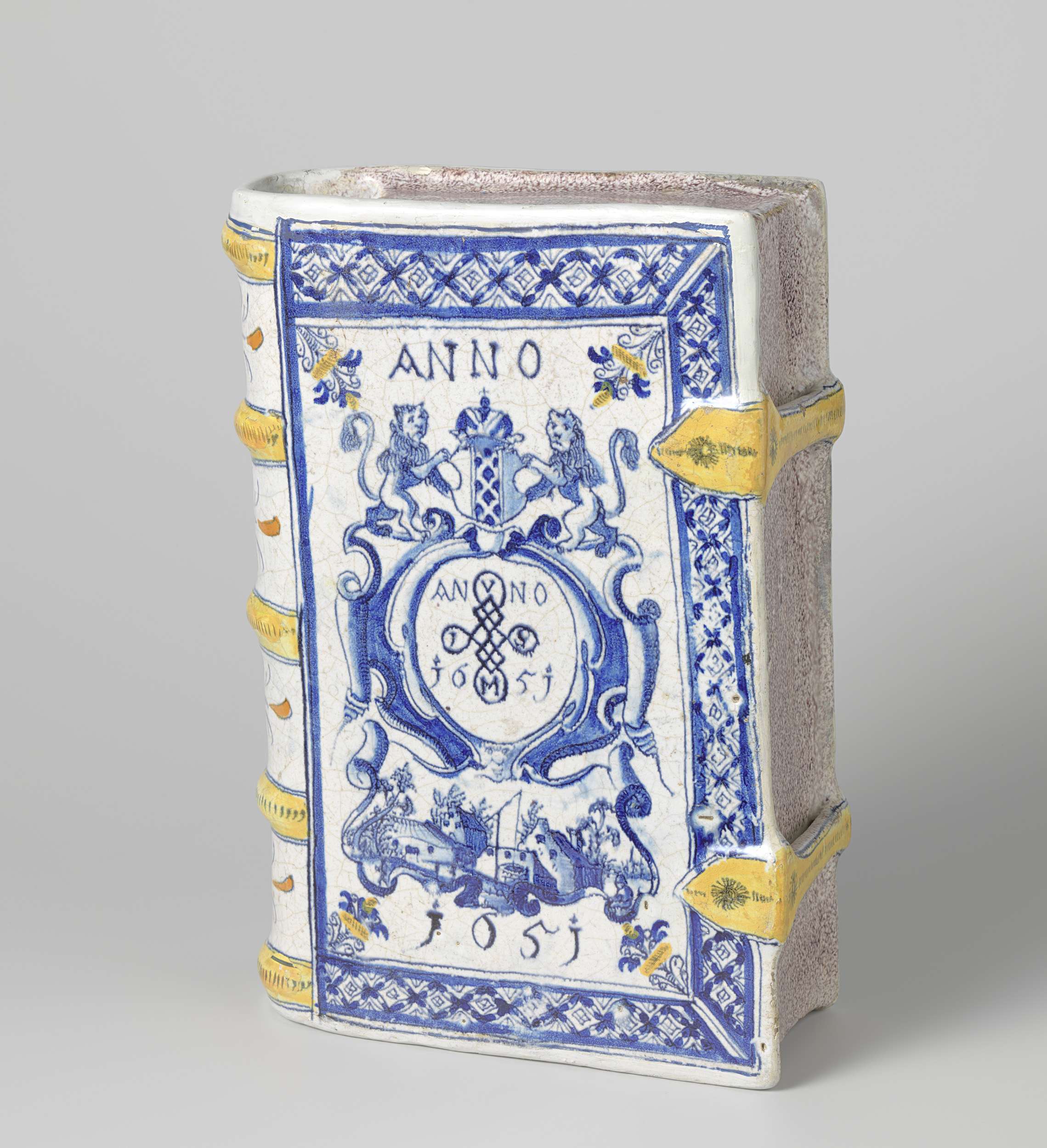 drinkbeker van veelkleurig beschilderde majolica, in de vorm van een boek. Op de voor- en achterzijde is een cartouche geschilderd waarin de datering: ANNO 1651 en waarboven het wapen van Amsterdam. Op de rug zijn vier rozetten geschilderd. (Nederlands)