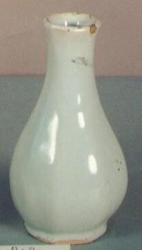Achtkantige vaas met ingesnoerde voet; peervormig en smal toelopende hals waarvan de mond iets naar buiten loopt; ongedecoreerd; (Nederlands)