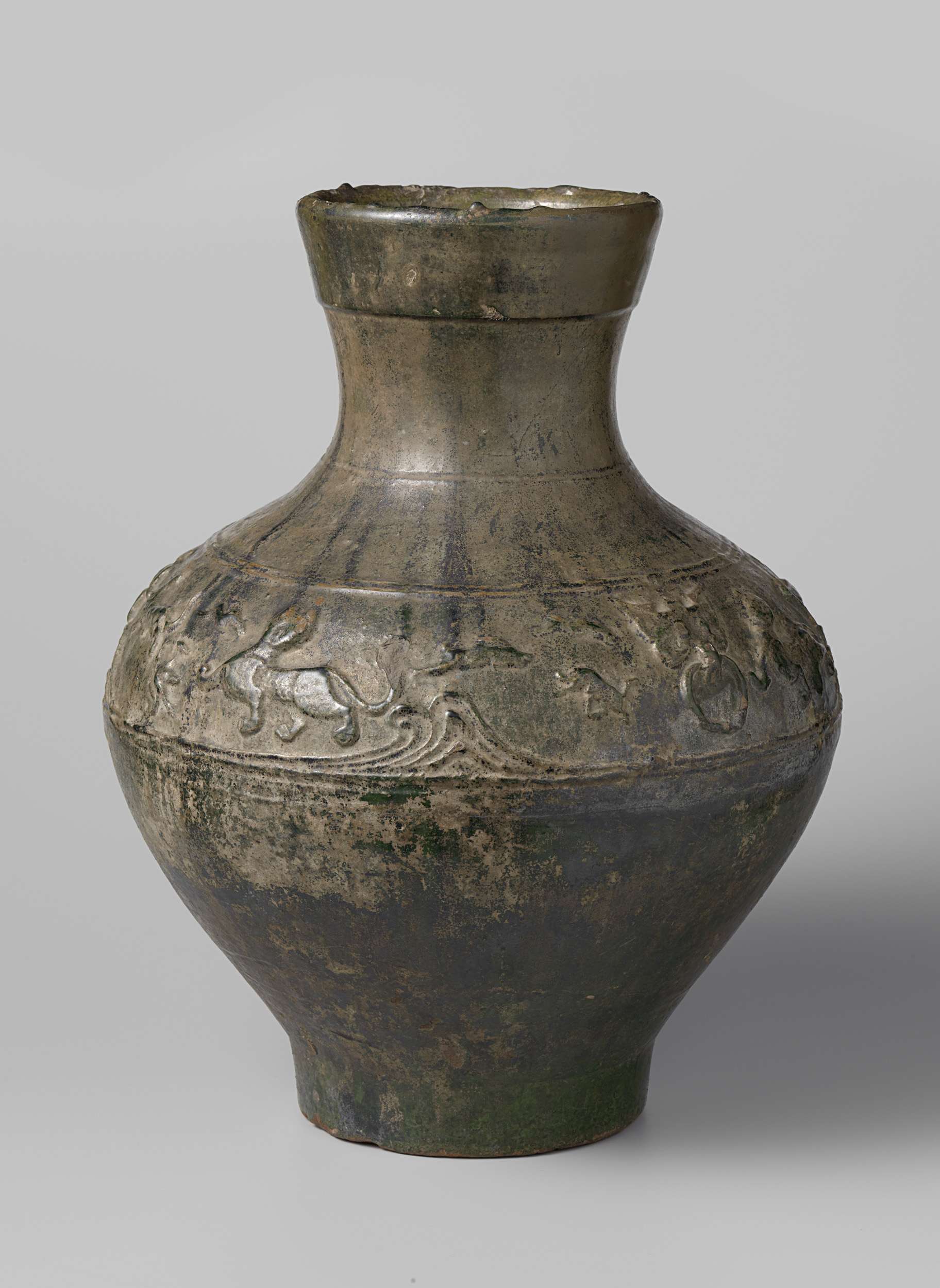 Vaas van aardewerk, bedekt met een groen glazuur. Op de schouder een band met jachttaferelen met mens- en dierfiguren in reliëf. Hiertussen tweemaal een 'taotie'-masker met een ring. (Nederlands)