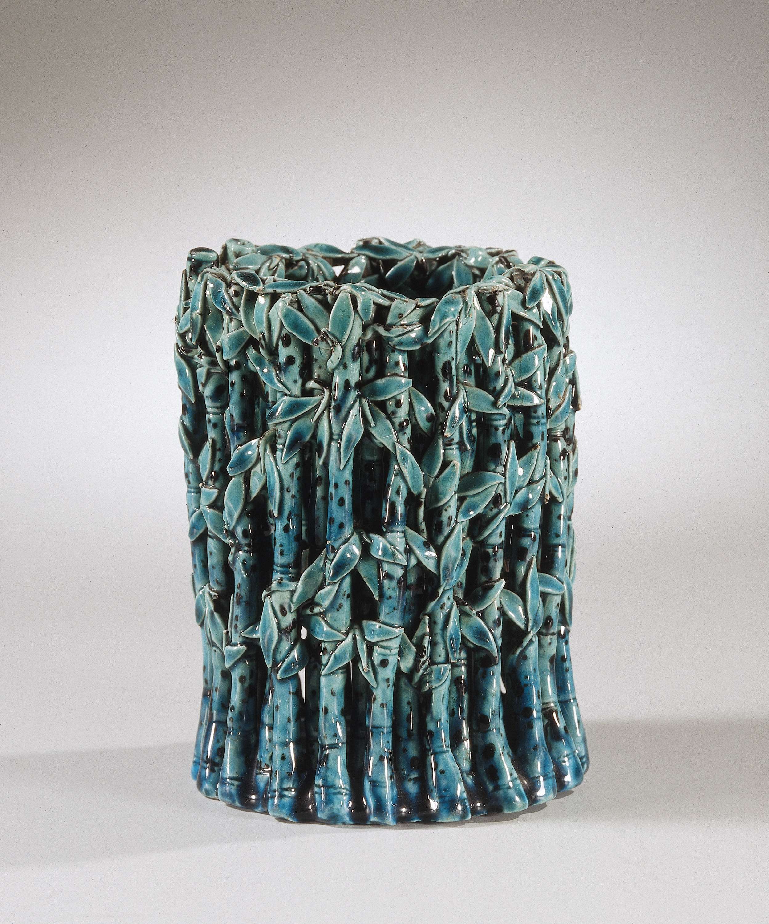 Cilindrische penseelhouder van porselein, bedekt met een monochroom turquoise, blauw glazuur. De wand van de houder is gemodelleerd in de vorm van een haag van bamboetakken en bladeren. Aan de binnenzijde is een aantal bladeren afgebroken. Monochromen. (Nederlands)