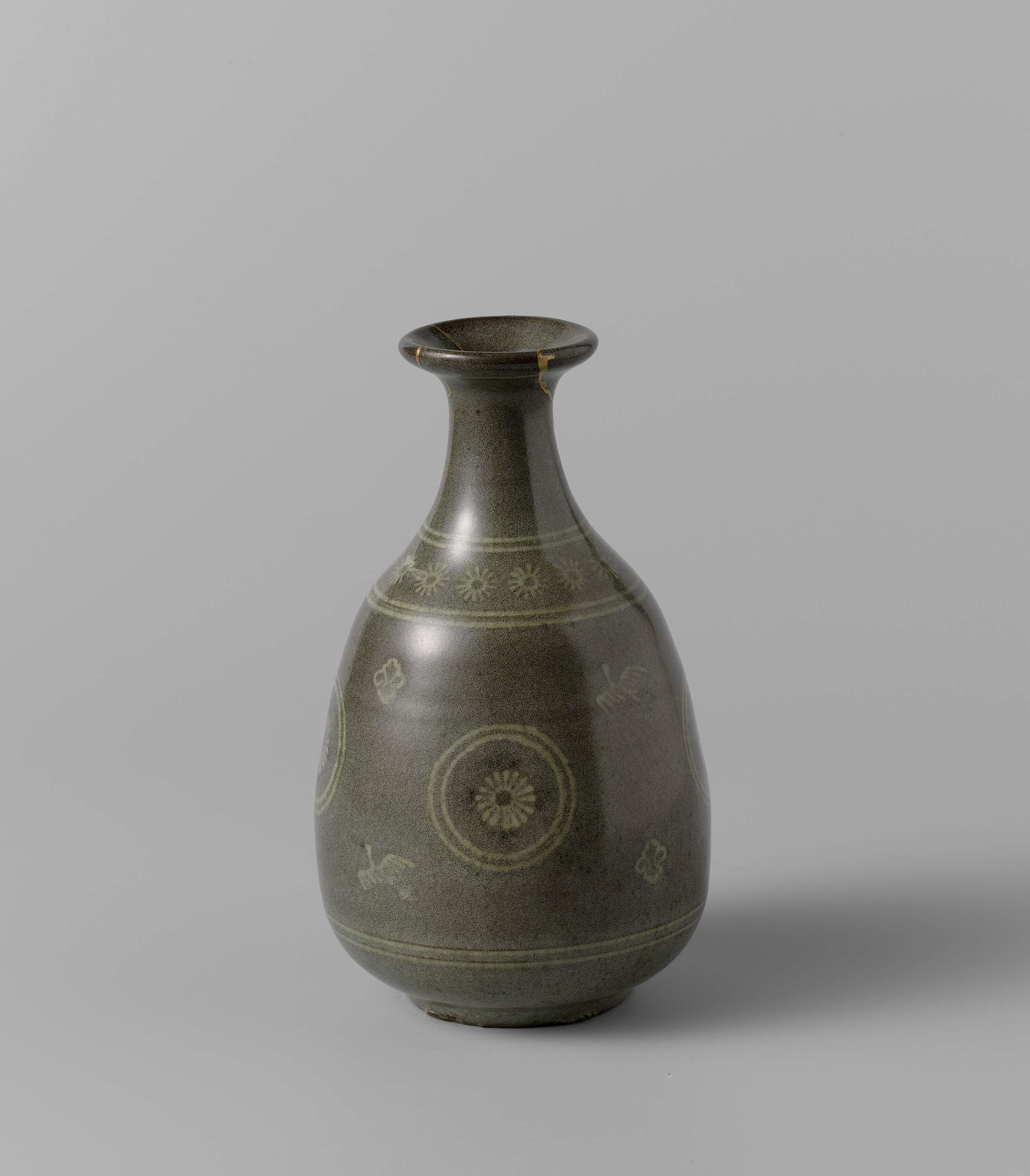 Flesvormige vaas van steengoed, met wit inlegwerk bedekt met een celadongroen-glazuur. De vaas heeft een eivormig lichaam en een smalle, naar boven toe uitlopende hals. Op de buik viermaal een gestileerde bloem in een medaillon met daartussen telkens een vogel en een blad. Op de schouder een band met gestileerde bloemen. De vaas heeft enkele barsten die gerestaureerd zijn met goudlak. Karatsu. (Nederlands)