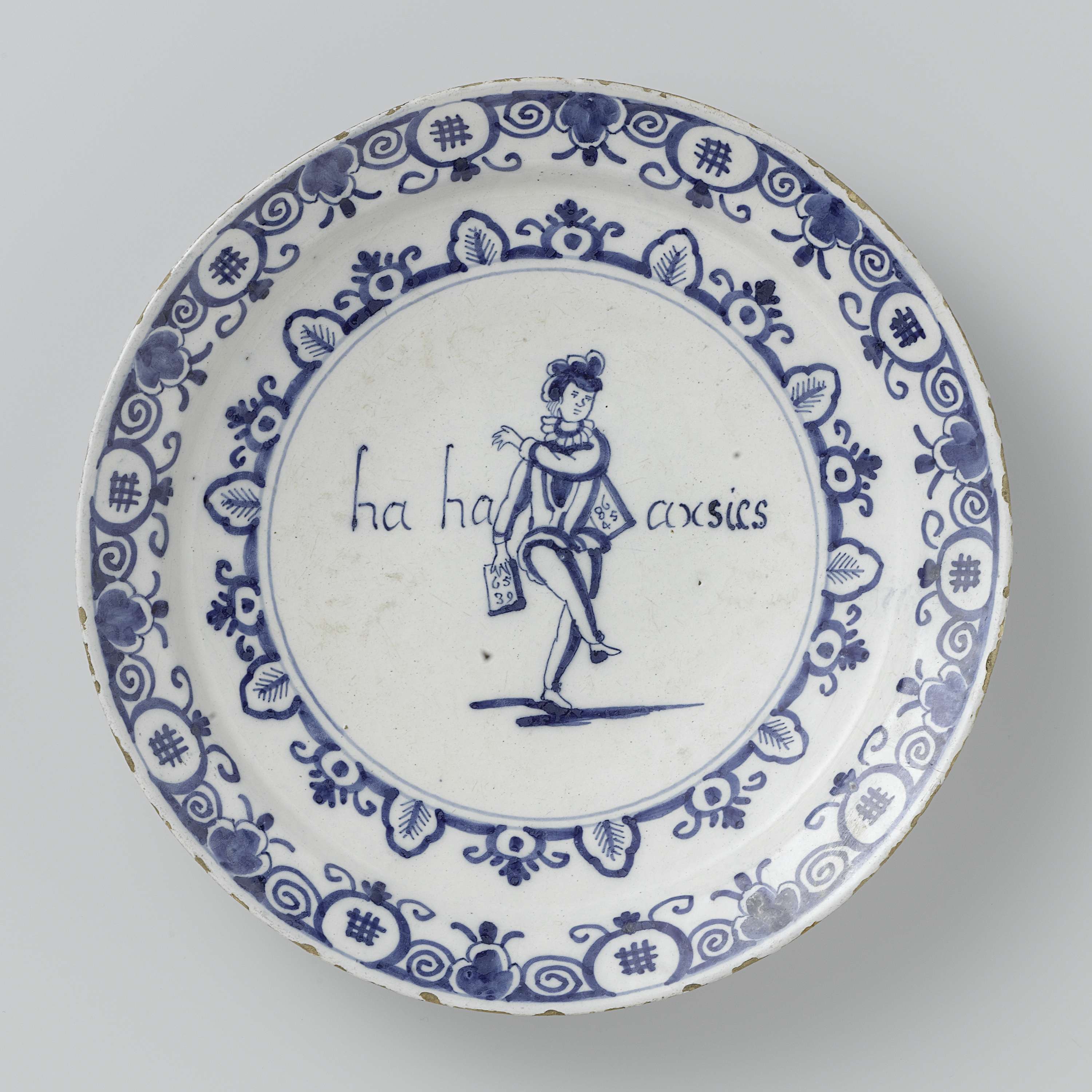 Bord met een voorstelling in blauw in de glazuur van een potsenmaker met tekst: Ha Ha Axsies, zogenaamd actienbord (Nederlands)