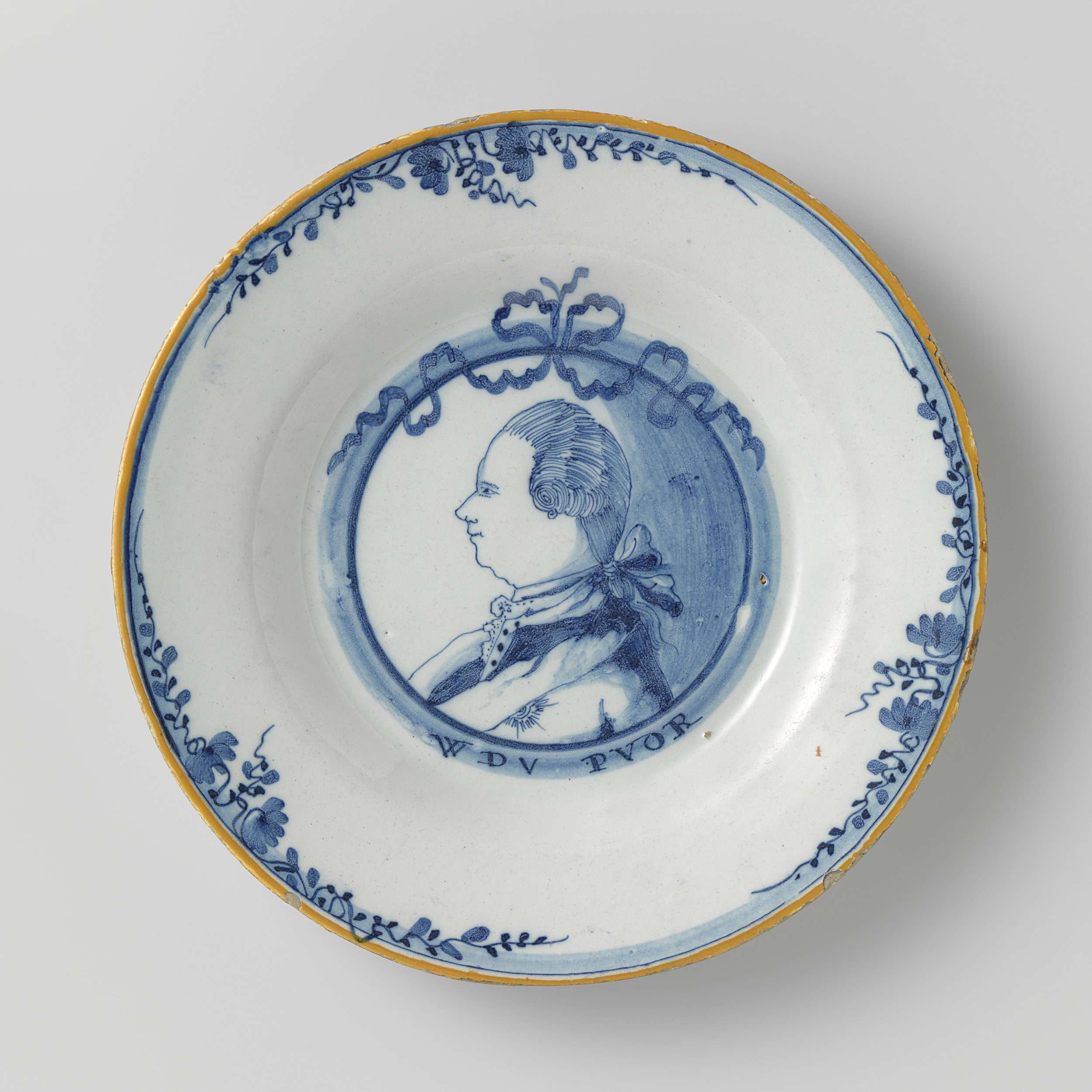 Rond bord van veelkleurig beschilderde faience, met op het plat een portret van prins Willem V met het onderschrift: WDV PVOR. Op de rand zijn drie bloem- en bladranken geschilderd. Gele bies. (Nederlands)