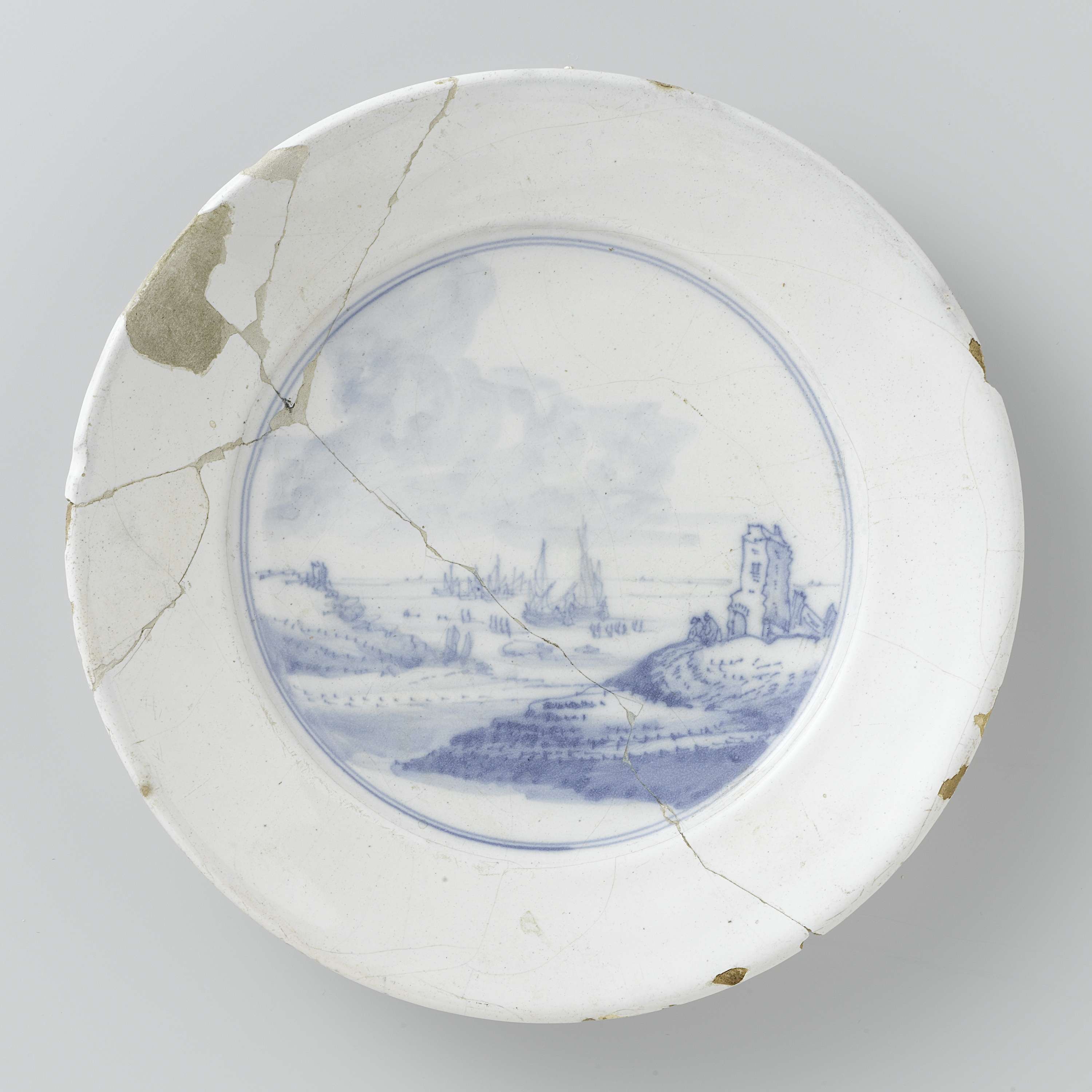 Rond bord van blauw beschilderde faience. Op het plat is een riviergezicht met schepen geschilderd. Het bord is een bodemvondst uit Delft. (Nederlands)