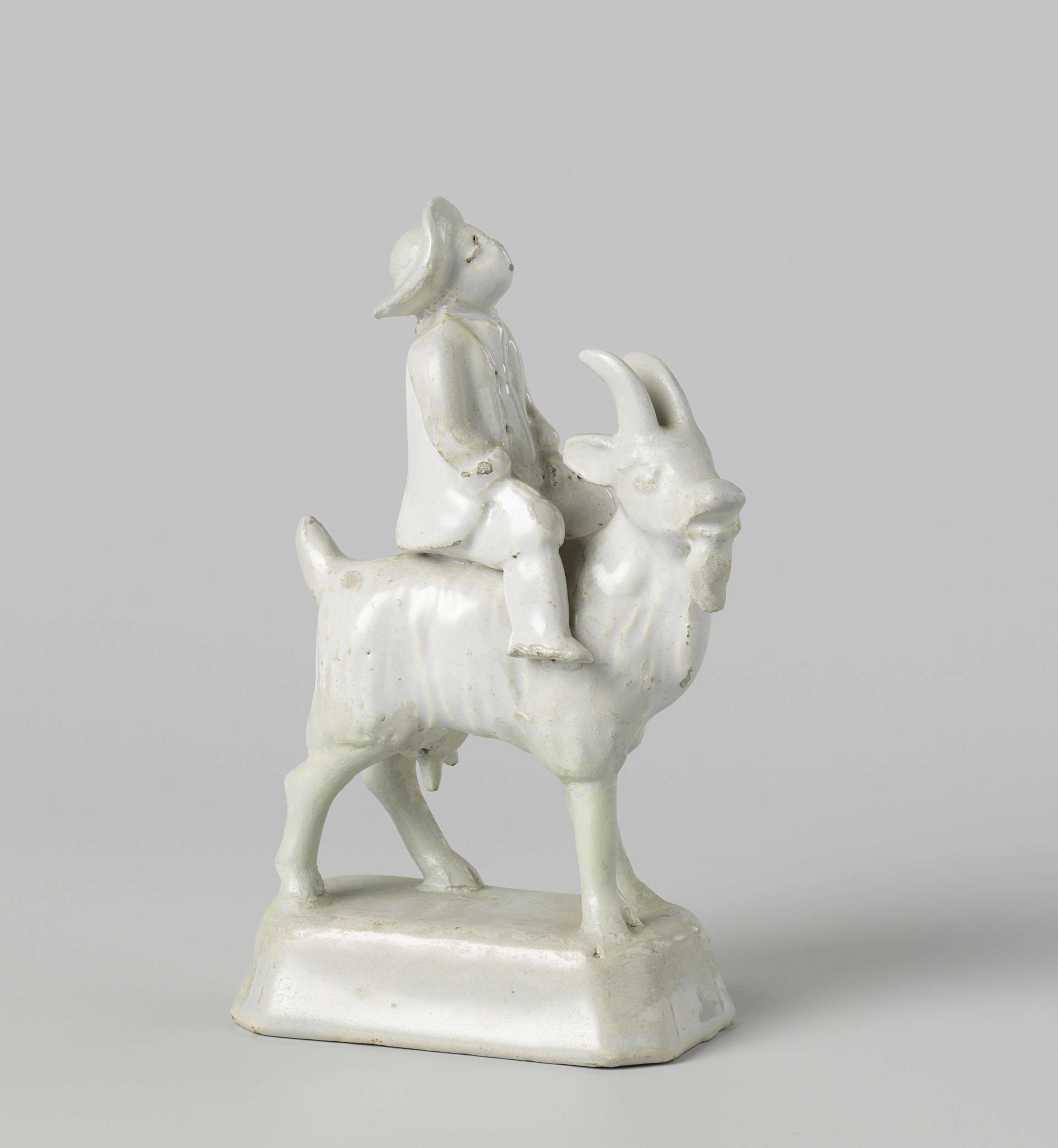 Beeld van ongedecoreerde faience. Op een rechthoekig voetstuk met afgeschuinde hoeken staat een geit met op de rug een man met een hoed. Het rechter achterbeen van de geit is voor het linker achterbeen geplaatst. (Nederlands)