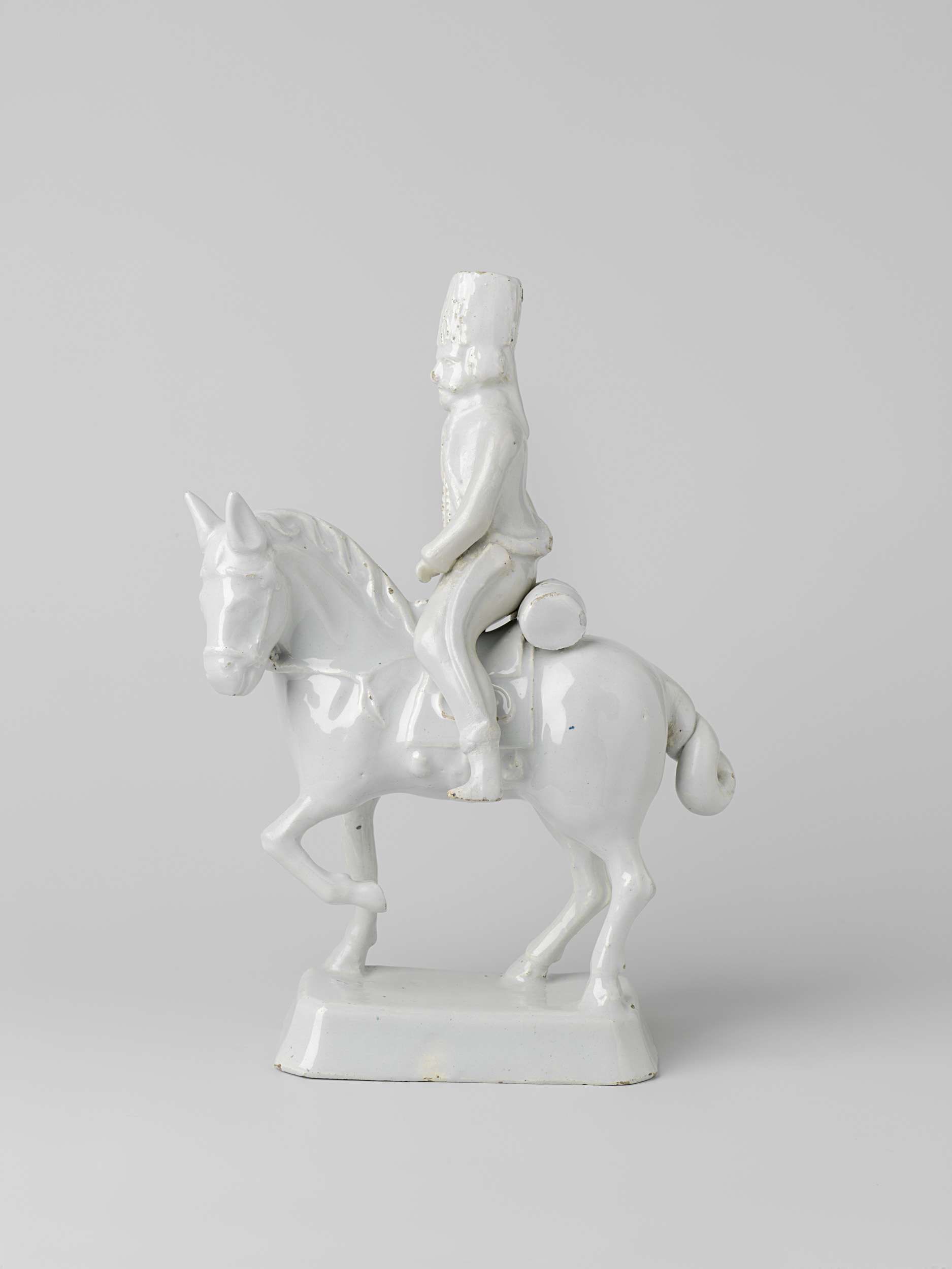 Ruiter van ongedecoreerde faience. Het paard staat op een rechthoekig voetstuk en de ruiter zit er los op. De ruiter draagt een berenmuts en een Duits uniform uit de tweede helft van de 18de eeuw. Het paard heeft zijn linker voorbeen opgeheven. Bij de ruiter hoort een identiek exemplaar met invnr. BK-1955-403-b. (Nederlands)