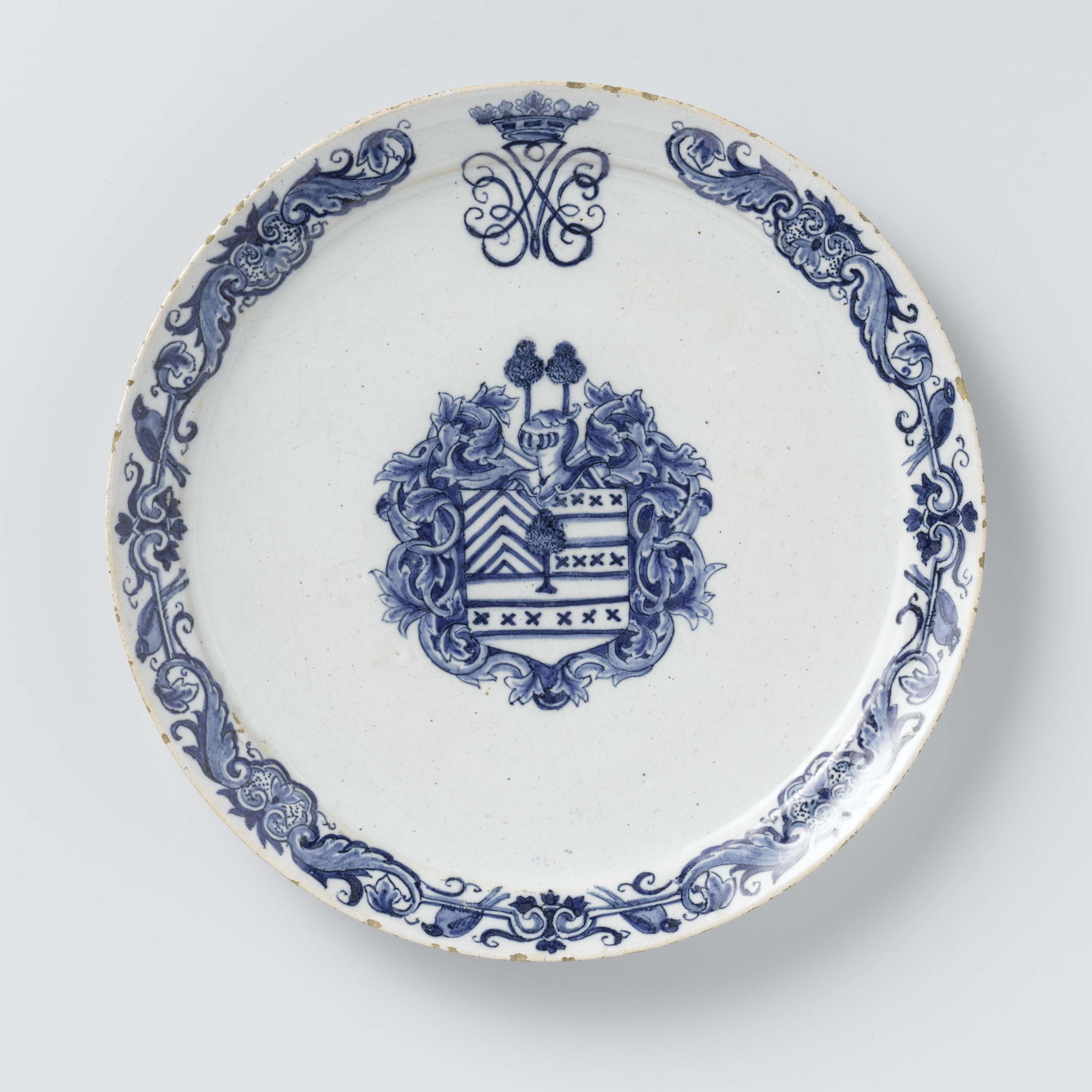Bord van aardewerk beschilderd in blauw op tinglazuur met in het plat een onbekend wapen, mogelijk van een lid van een onbekend geslacht Van Egmond. Daarboven een gekroond spiegelmonogram J.V.E. De rand gedecoreerd met bladwerk. (Nederlands)