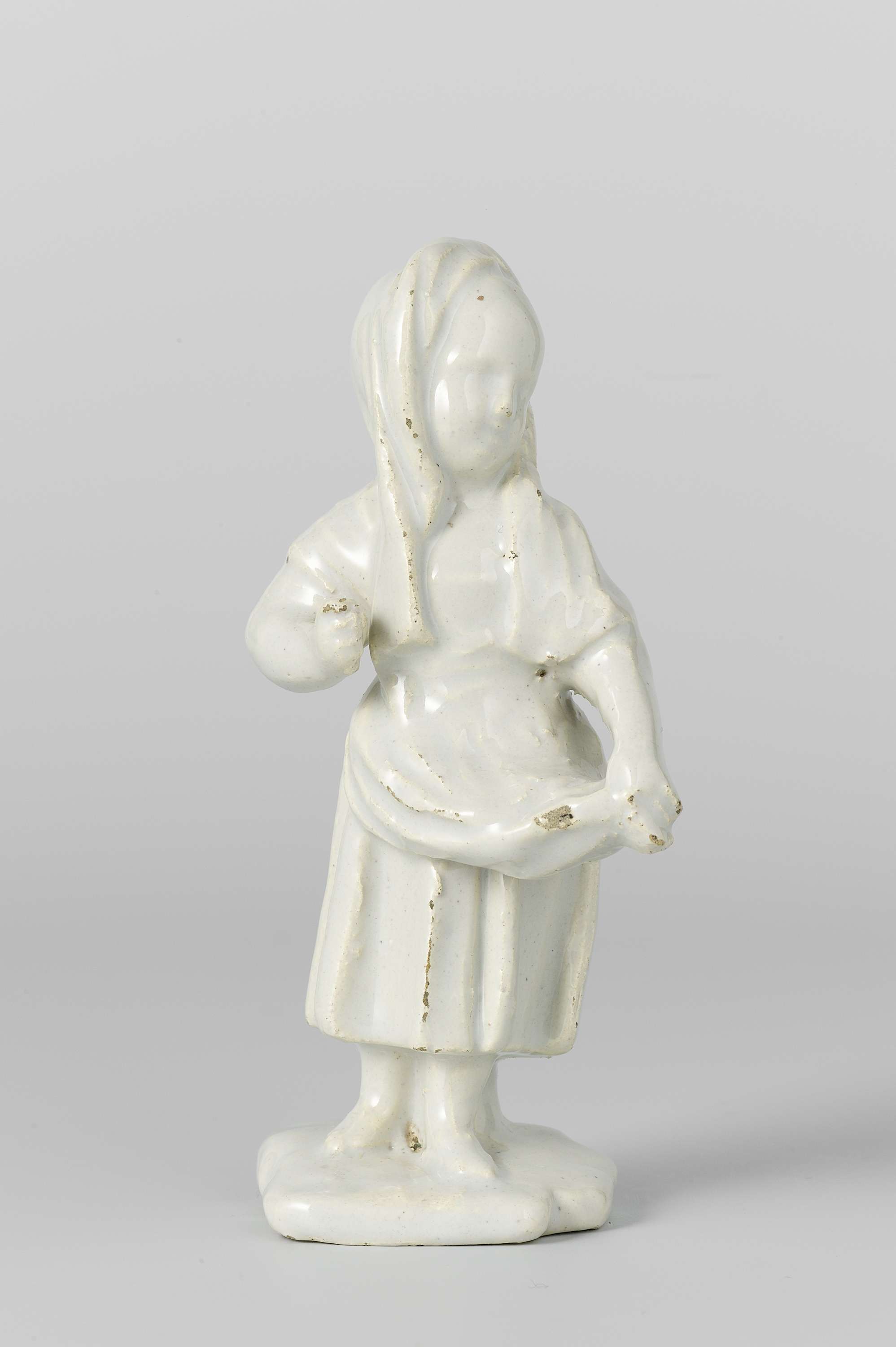 Kinderfiguur van faience, voorstellende een meisje. Wit geglazuurd. (Nederlands)
