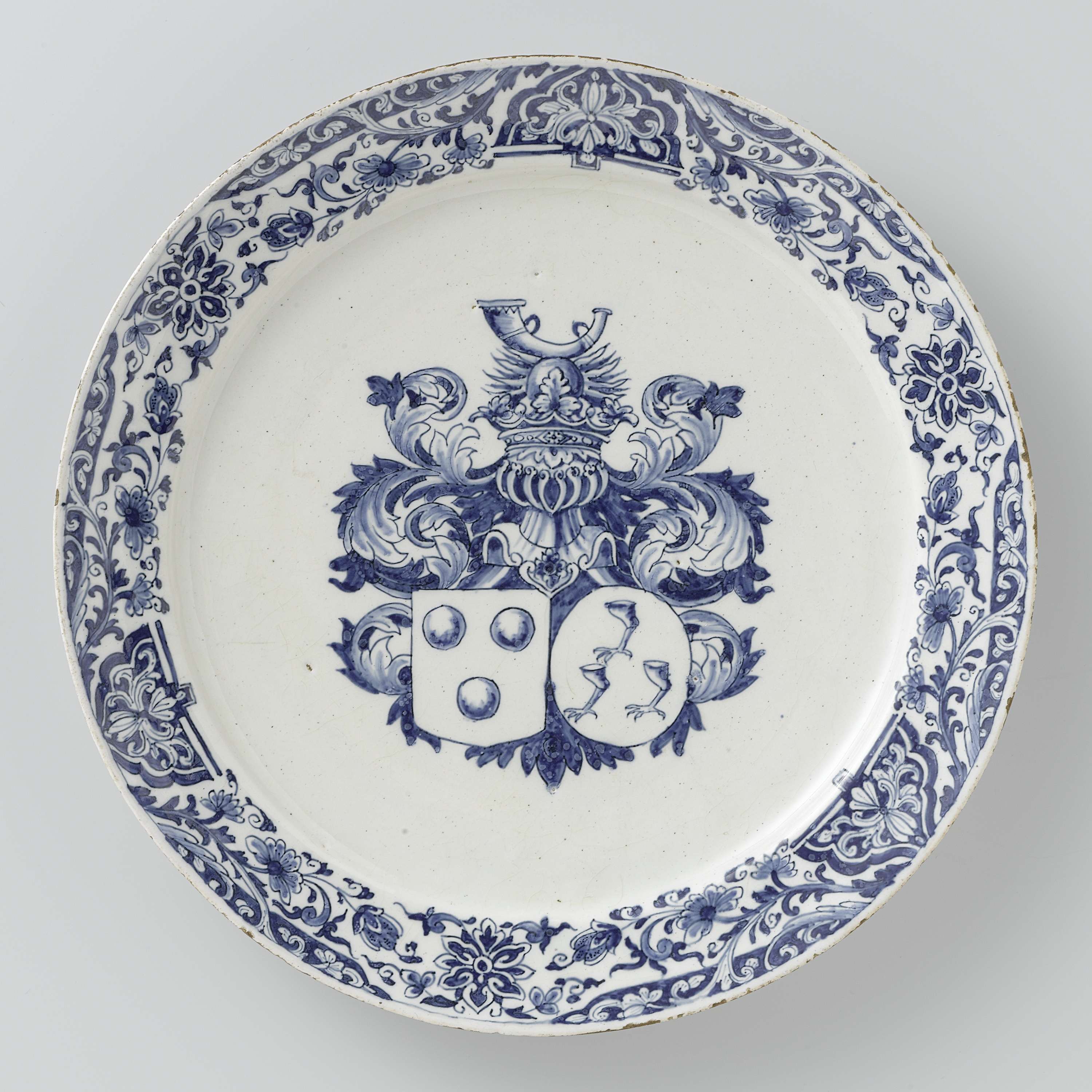 Bord van ardewerk, beschilderd in blauw op wit tinglazuur met op de rand een patroon van bloemen en rozetten en op het plat het alliantiewapen van Franc Evertsz van Bleiswijk en Anna van Hoogenhouck, gehuwd 1671. (Nederlands)