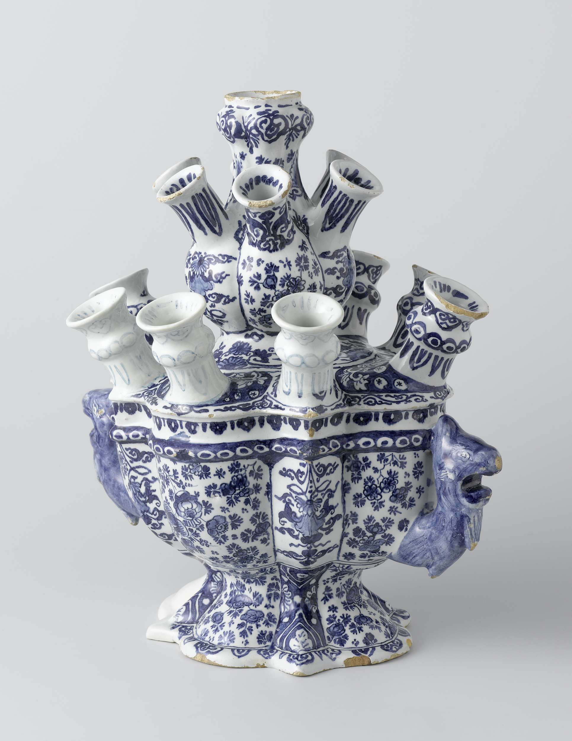 Bloemenhouder van faience met vijftien tuiten en twee griffioenkoppen. Blauw beschilderd in glazuur. (Nederlands)