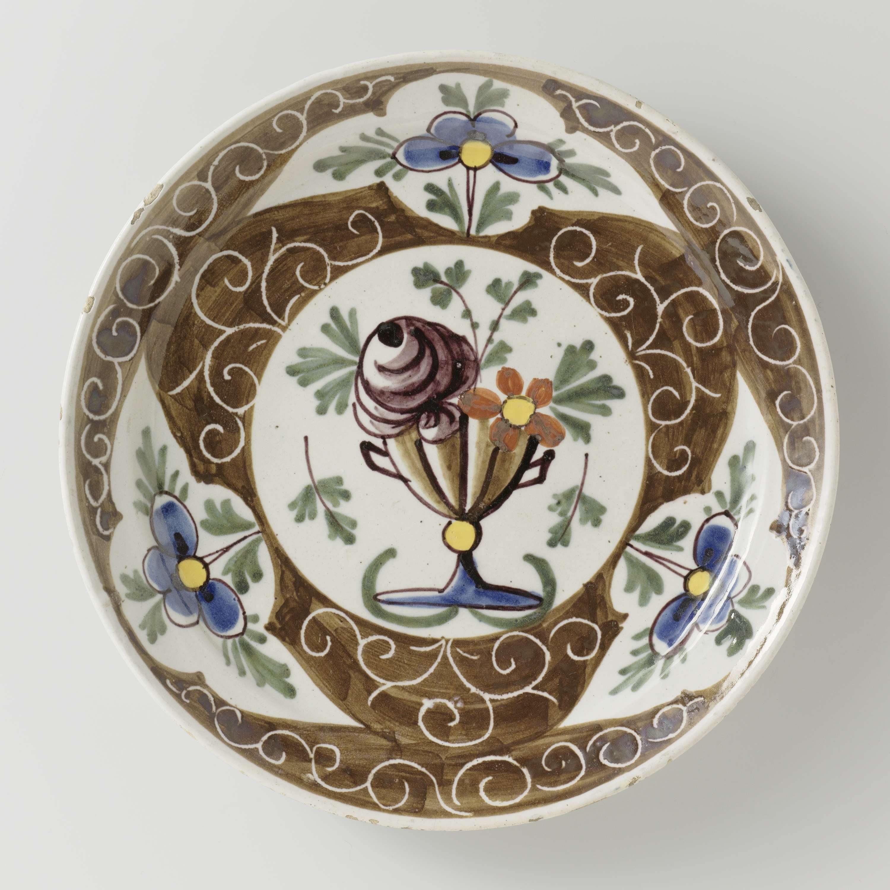 Bord van faience veelkleurig beschilderd met een vaas met bloemen en een gedecoreerde rand. (Nederlands)