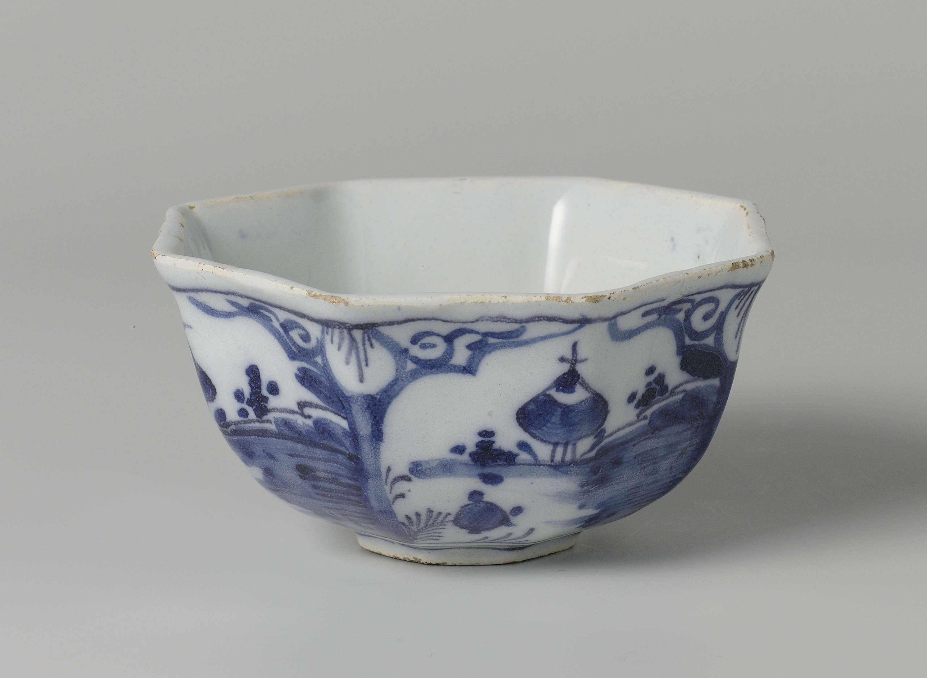 Kom met acht hoeken van faience. Blauw beschilderd. (Nederlands)