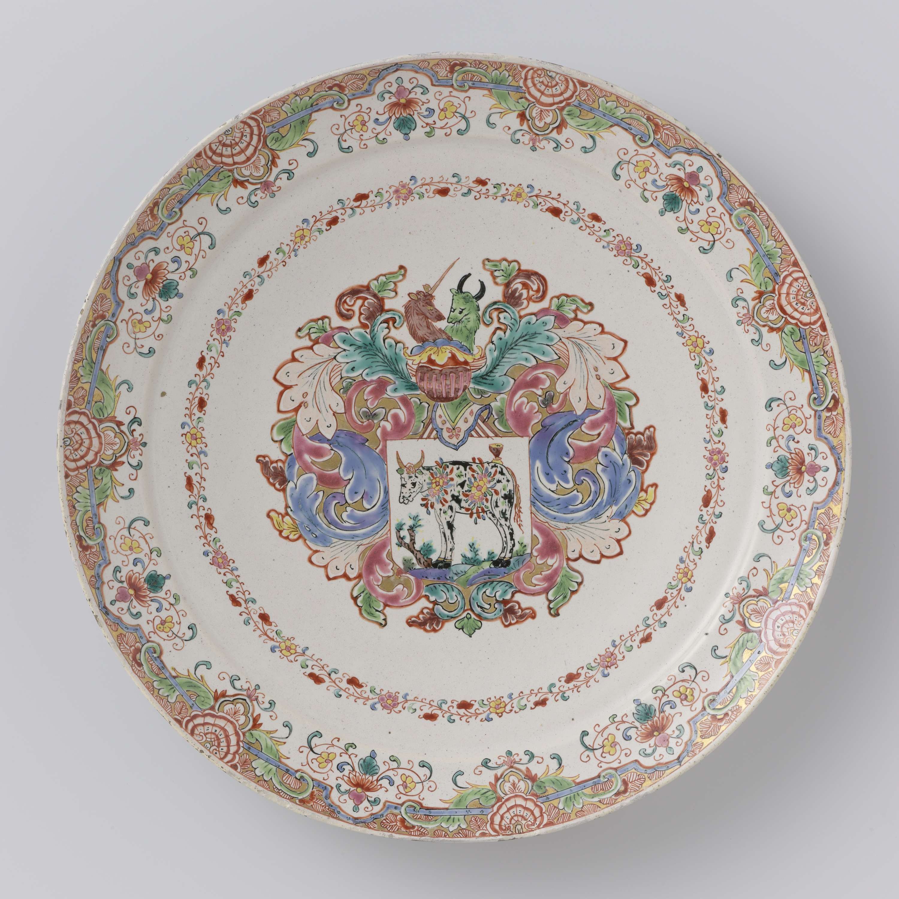 Bord veelkleurig beschilderd met een onbekend familiewapen met als helmteken een eenhoorn en een koe. Langs de rand een band bestaande uit spiralen, bloemen, schelpmotieven en lambrequins. (Nederlands)
