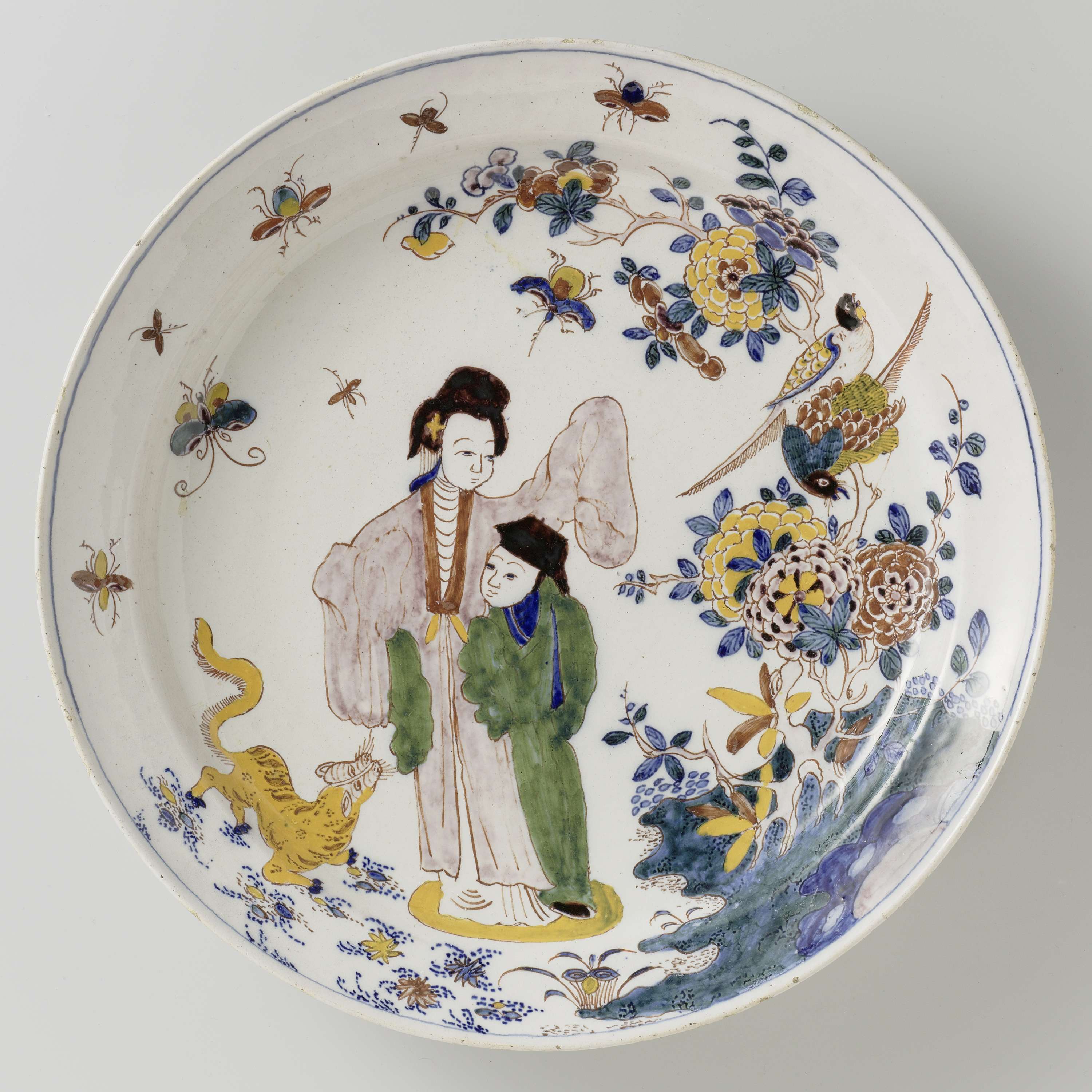 Schotel van aardewerk bedekt met wit tinglazuur, waarop een voorstelling op het plat doorgaande over de rand geschilderd is in blauw, groen, geel, rood, violet en paarsbruin. Voorgesteld zijn twee Chinese figuren, een vrouw en een kind, staande, tegen elkaar geleund, op een geel ovaal grondje. Links van hen een gele tijger, rechts rotsen met bloeiende planten met twee vogels. In de lucht een aantal insekten. Rode contouren. Een blauwe bies langs de rand. (Nederlands)