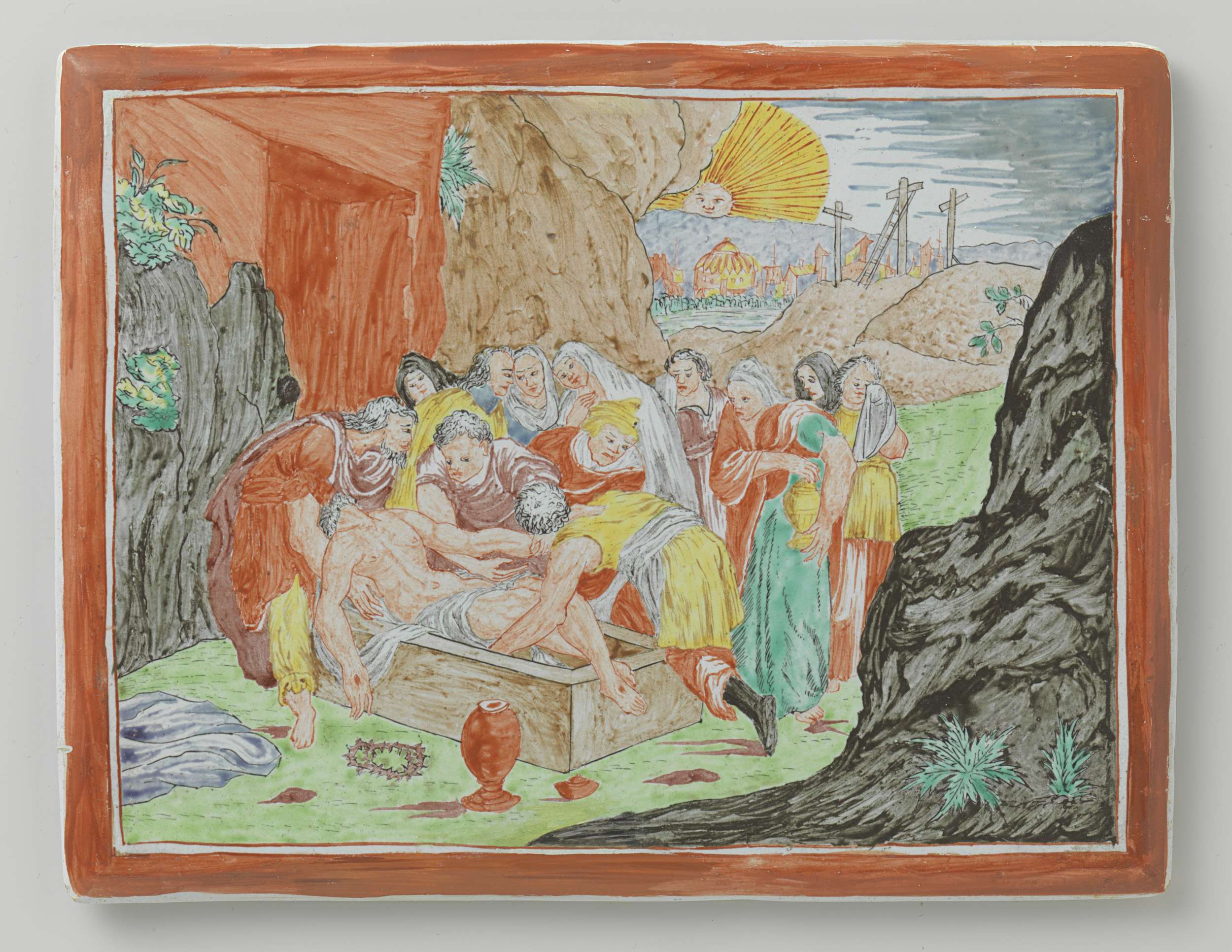 Rechthoekige plaat veelkleurig beschilderd met de graflegging van Christus ontleend aan een prent van Johannes Sadeler naar een tekening van Dirck Barendsz. (Nederlands)
