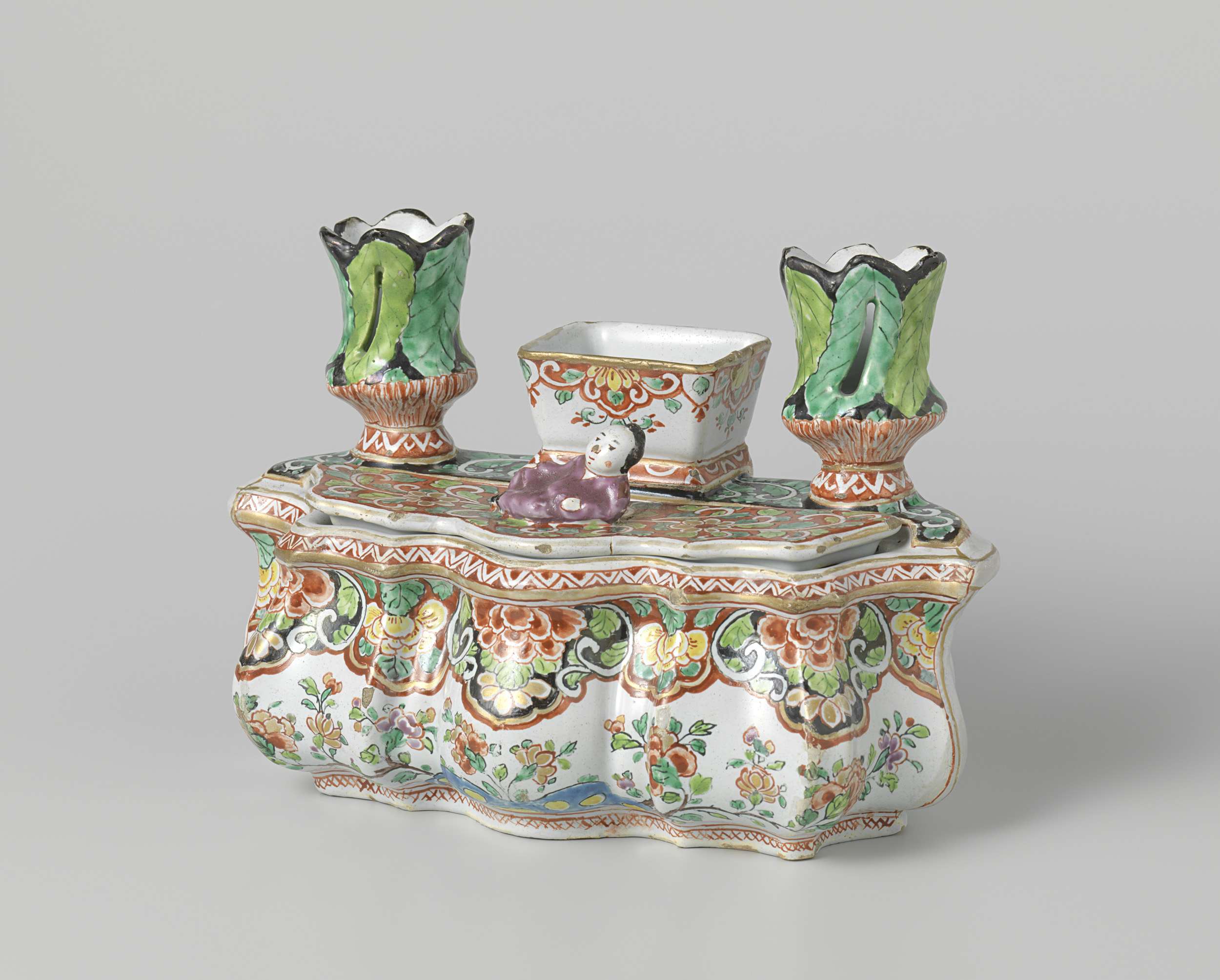 Langwerpig inktstel met bakje tussen twee kaarsenhouders en een deksel met een liggend mannetje. De veelkleurige beschildering bestaat uit lambrequins en bloemtakken. (Nederlands)