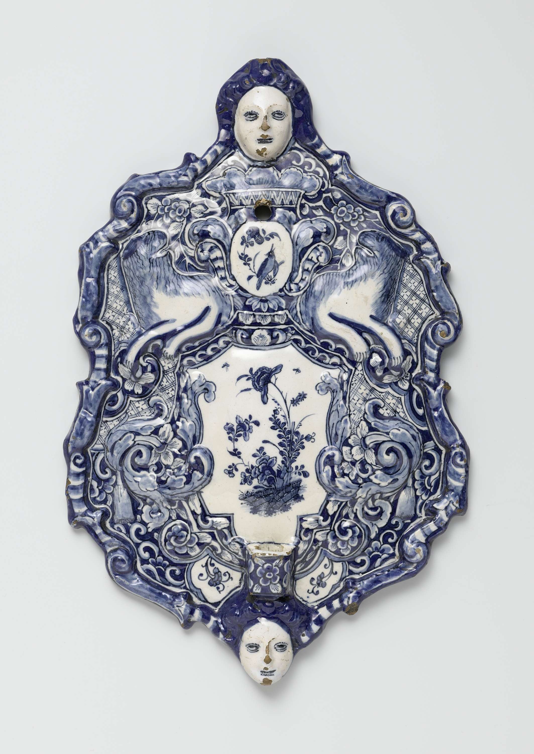 Achterplaat van een wandarm van faïence, ovaal cartouchevormig, met twee koppen en twee leeuwen boven een uitgespaard vak waarop een bloemtak in blauw. (Nederlands)