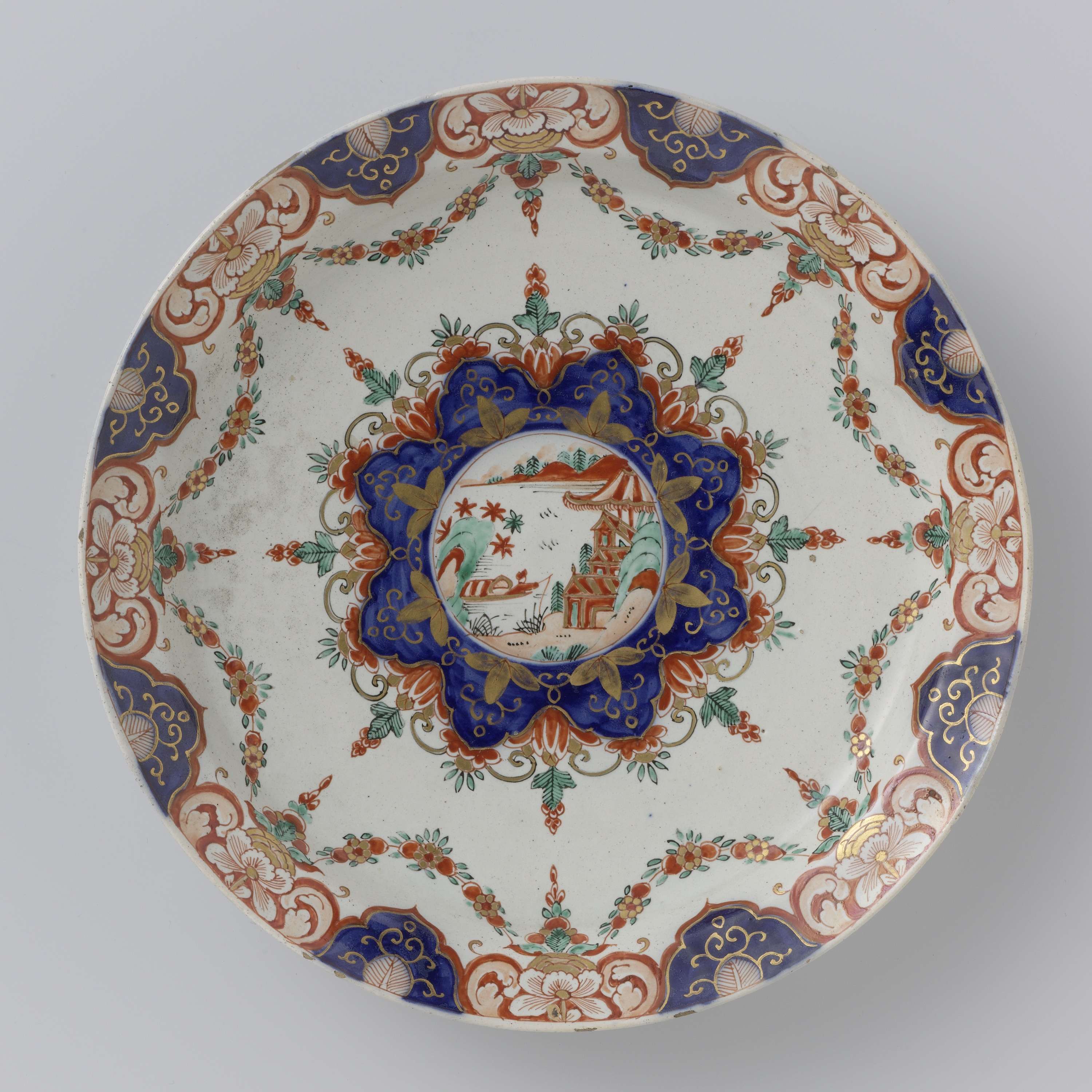 Bord van faïence. Veelkleurig beschilderd met een Chinees waterlandschap en lambrequins, in imari kleuren. (Nederlands)