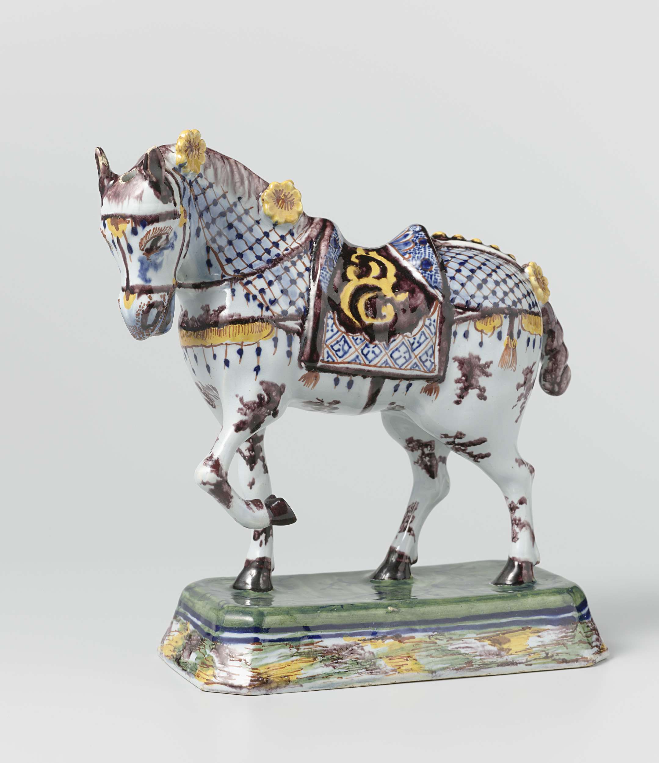 Dierenfiguur van faience, voorstellende een opgetuigd paard. (Nederlands)