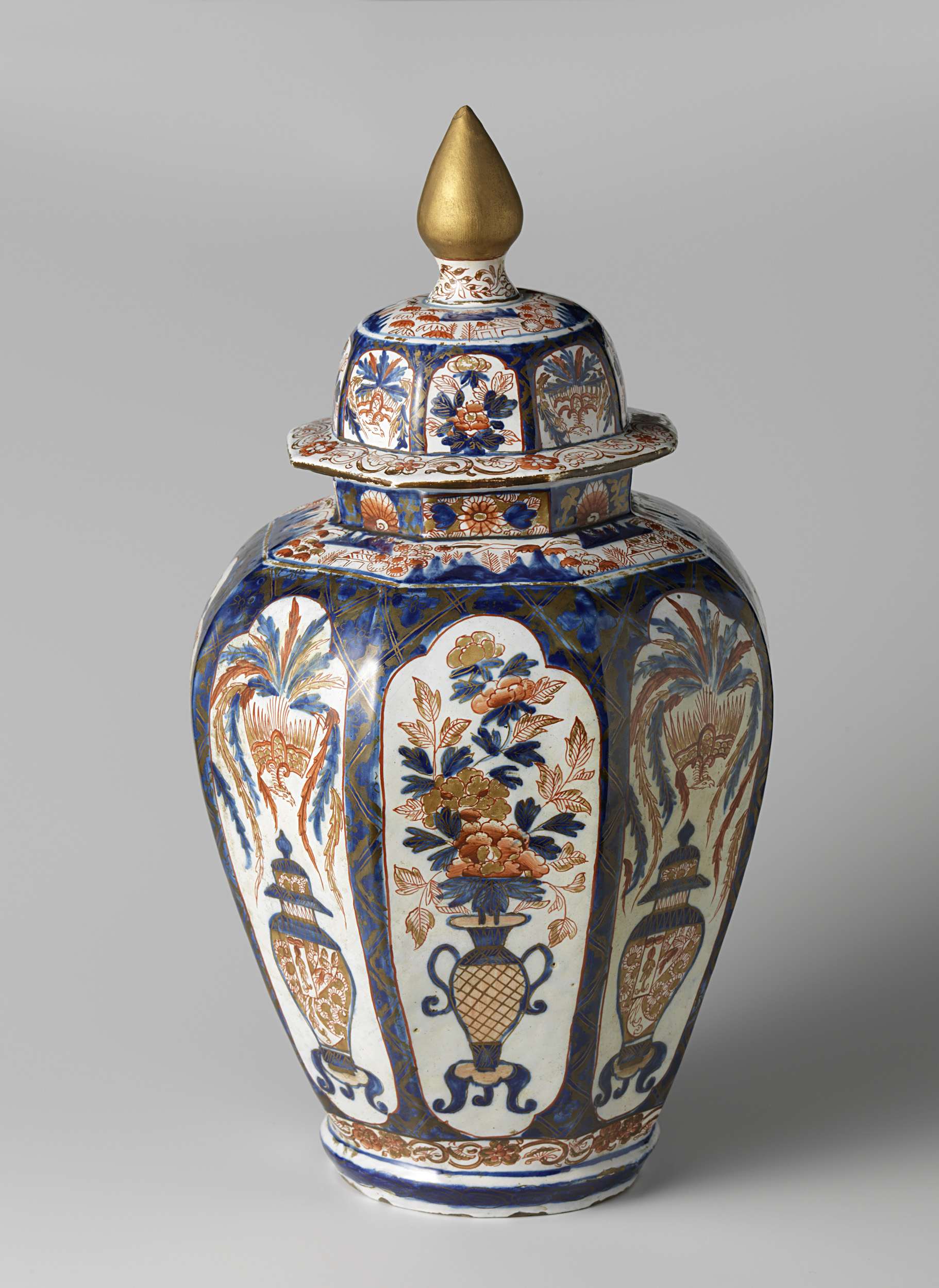 Pot met deksel, van veelkleurig beschilderde faïence. De pot is achtkantig en op de acht kanten zijn acht vakken geschilderd. In vier vakken is een vaas met twee s-vormige handvatten, staand op een driepotig voetstuk en gevuld met bloemen geschilderd, in de andere vier vakken een pot met deksel op een driepotig voetstuk waarboven een feniks. De pot is onderdeel van een stel en is gemerkt. (Nederlands)