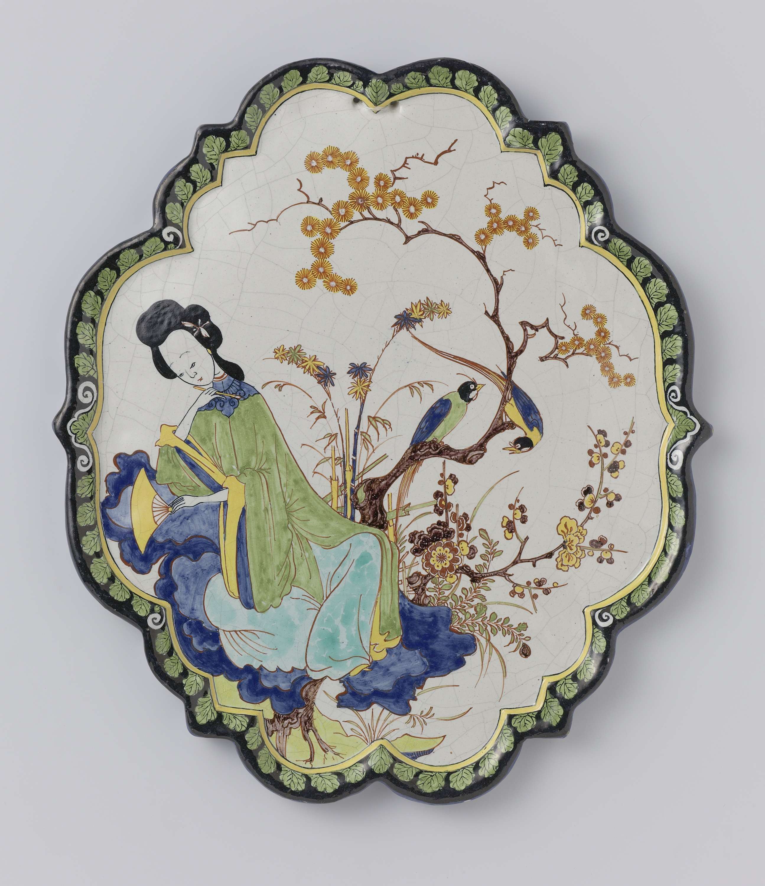 Plaat van faience. Veelkleurig beschilderd met een chinese vrouw in een tuin. (Nederlands)
