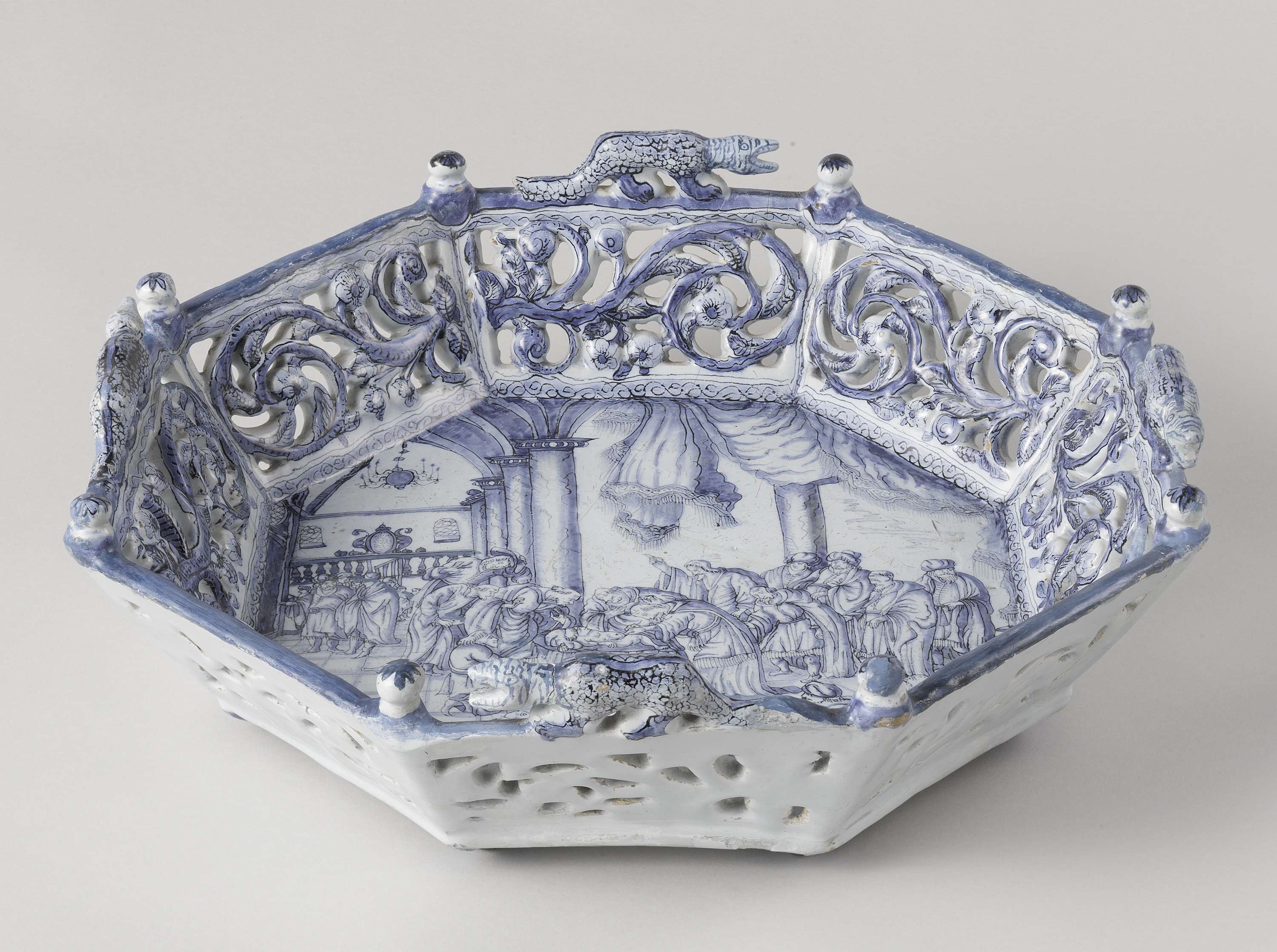Achtkantige luiermand van faience. Blauw beschilderd met de afbeelding van een besnijdenis (Luk 2:21). (Nederlands)